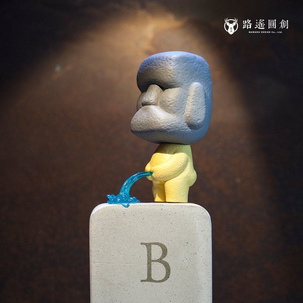 本次的「blue 摩艾」共六款,藉著頭與身體的插件設計,使單款高度來到份量十足的7 公分,包含在上班、呈現站姿的摩艾(圖 A),身上有許多插畫象徵遊客的筆跡,第二款(圖 B)是在尿尿中的摩艾,半透明的水藍色尿尿十分有意思,身體則是呈現膚色;值得一提的是,在 blue 摩艾的設定中,有著工讀生的神秘內在,在卸下摩艾衣服後,才會是以肉色呈現。