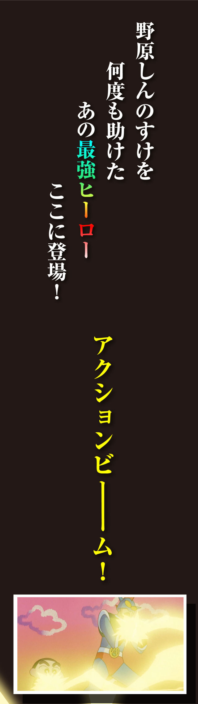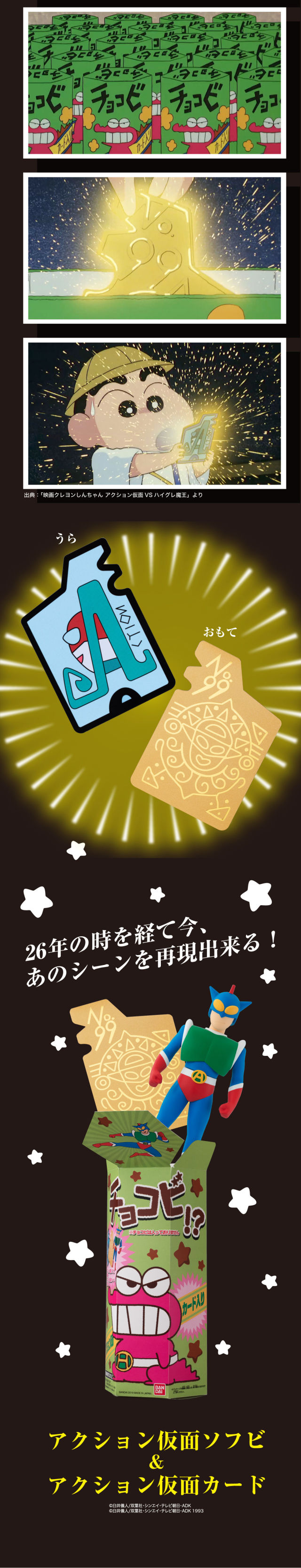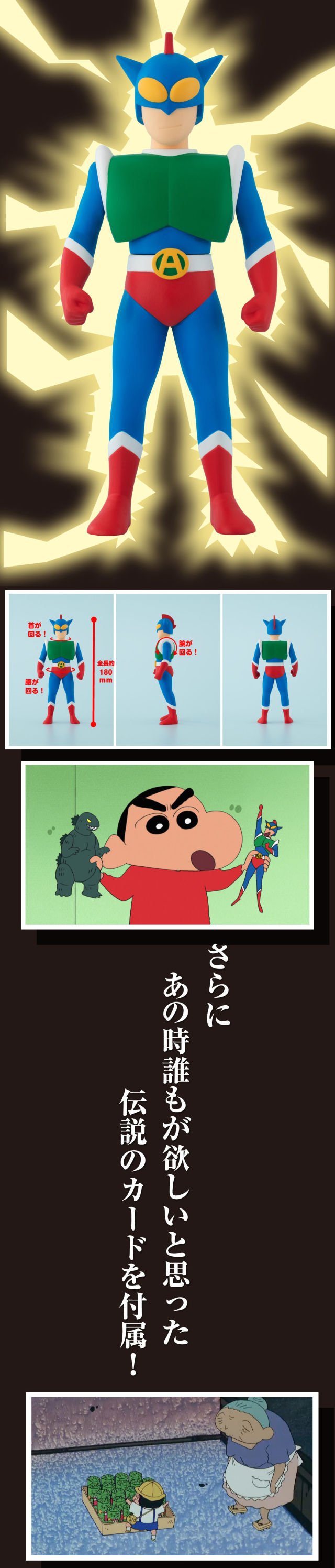聽到那熟悉的聲音了嗎?「哇哈哈哈哈~哇哈哈哈哈~」,一聽到這令人感到充滿自信而又帶著溫暖的爽朗笑聲,沒錯!就知道是他!使用動感光波消滅敵人,拯救世界的動感超人(アクション仮面)要登場了!萬代 BANDAI 即將推出《蠟筆小新》(クレヨンしんちゃん)裡面主角小新最喜愛的英雄「動感超人」的 PVC 立體人形!預定 2019 年 12 月發售,價格為 2,800 日圓(含稅)。
