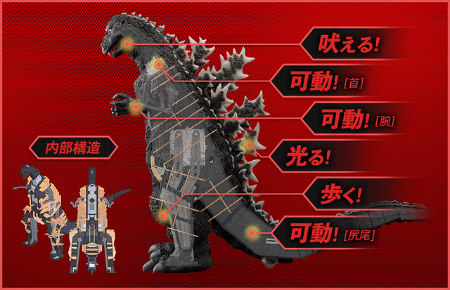 這款「初代哥吉拉」遙控模型由大師級怪獸原型師「酒井裕司」擔任原型製作、知名遙控車製造商日本京商設計內部骨架,打造出全高 60 公分、可行走、舉手、擺尾、張口、左右迴旋的哥吉拉模型,所有動作皆平滑地進行,彷彿電影戲服般的動作,更有讓背鰭發出藍光、內藏吼叫、熱線發射、主題曲『哥吉拉上陸』『迎擊哥吉拉』的音效!