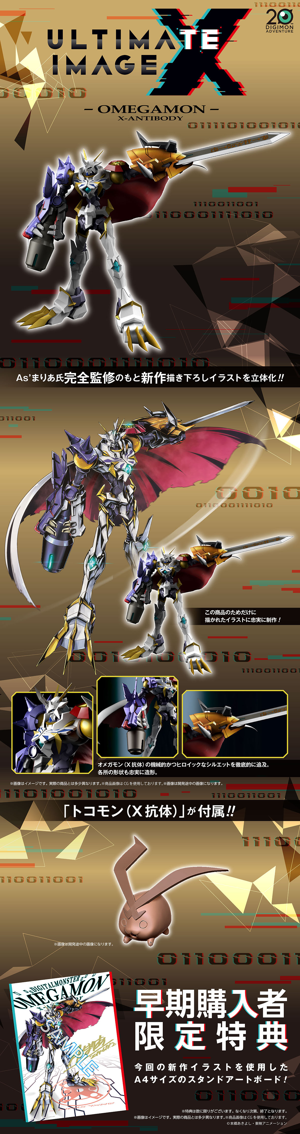 「ULTIMATE IMAGE 奧米加獸X抗體」以 As'maria 老師為商品全新繪製的插圖為基礎製作,並請老師完全監修商品,忠實再現邊緣銳利的鎧甲造型、極具機械感的細節,氣勢十足。不過目前僅釋出了開發中 CG 圖,還無法確定實際造型會不會再次修改。此外,商品中還將附上「迪哥獸(X抗體)」模型,早期購入還能獲得特典:As'maria 老師繪製的「A4 尺寸新作插畫」!