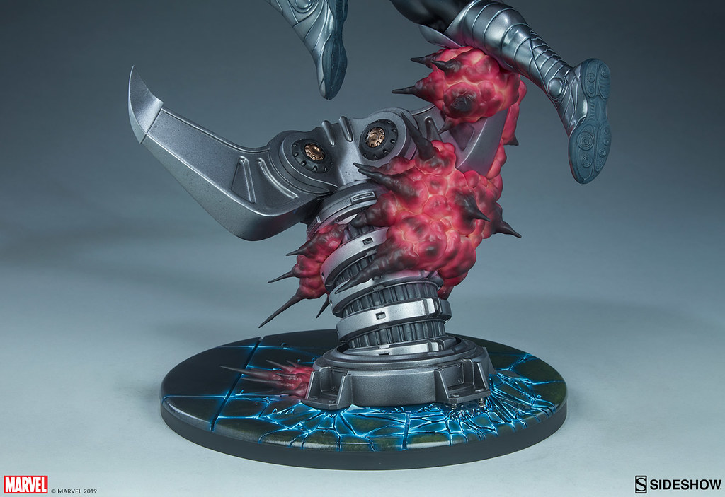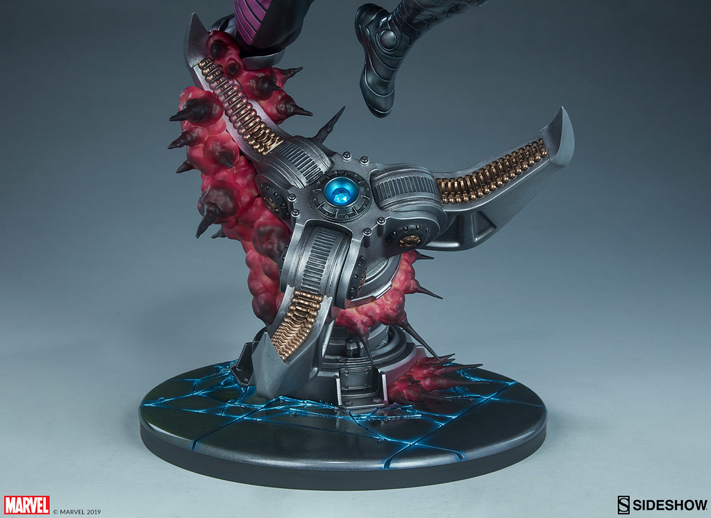 本作尺寸為長 60.9 × 寬 48.2 × 高 53.3 公分,藉著底部的巨大機械爪,展現出金牌手極為動感的飛躍姿態,右手丟出爆炸牌、左手則拿持長棍,雙腿造型與飛舞的深褐色大衣使整體更具速度感,頭髮、臉部的膚質紋理、結實的肌肉形狀皆施以細膩的刻畫,更以塗裝表現出皮革、塑料、金屬的異樣質地,擁有厚重金屬感的機械爪也打造出豐富、精密的機構細節,底台同樣是以 Danger Room 為題設計,對X戰警有愛的玩具人一定要讓金牌手跟小淘氣搭配展示啊!