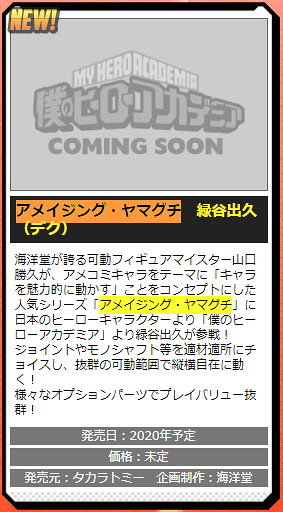 即將播出動畫版第四季的超人氣少年漫畫《我的英雄學院》日前於官方網站的週邊清單中,透漏最新玩具週邊「AMAZING YAMAGUCHI 綠谷出久」可動人偶預計於 2020 年內發售的消息,目前尚未釋出影像預覽。