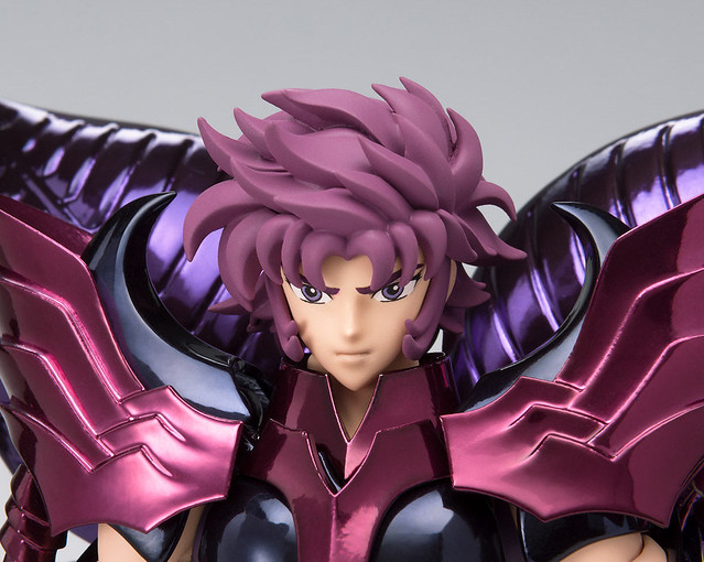 天魔星的聖衣造型算是比較特別一點的,吉因的背後有著像是花盛開般的翅膀裝飾,如同妖花盛開一般。聖衣未穿上前的擺放狀態時,天魔星的聖衣看起來就像是有位女子從花朵中綻放出來一般,非常特別,搭配上整體紫色系的視覺,更是漂亮。另外商品還特別附有三種頭部樣式可供玩家替換,包含普通表情、憤怒表情,以及戴著頭盔時候的眼部陰影神秘表情。(在故事中頭盔是被紫龍用聖劍給劈開的)