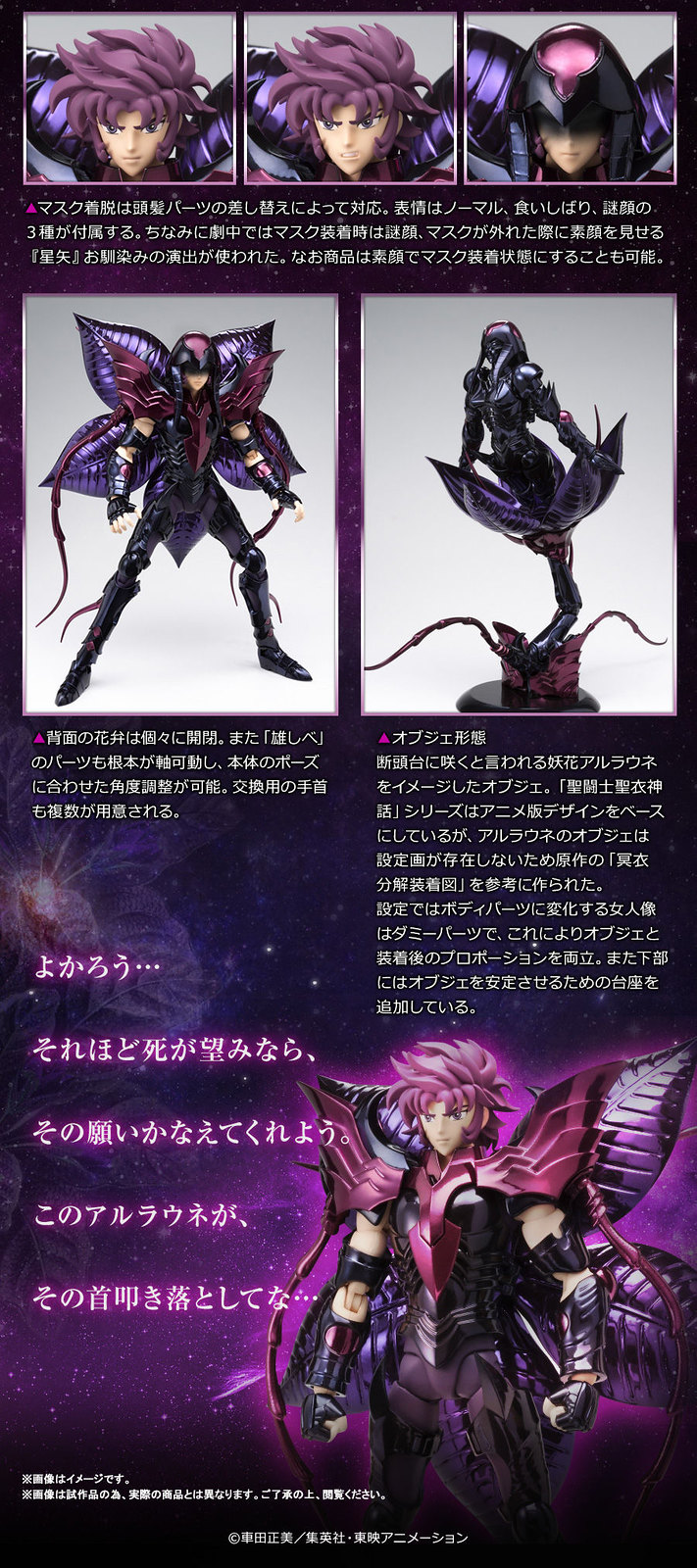 由日本萬代 BANDAI 所推出,受到許多老粉絲力挺的經典動漫作品《聖鬪士星矢》之最有人氣的相關收藏玩具系列「聖鬪士聖衣神話」,又有一款新的商品要推出了,就是在「冥王哈迪斯極樂淨土篇」登場的 108 位冥鬪士之一的「天魔星」阿路拉烏娜的吉因(アルラウネクィーン)。預計 2020 年 2 月發售。