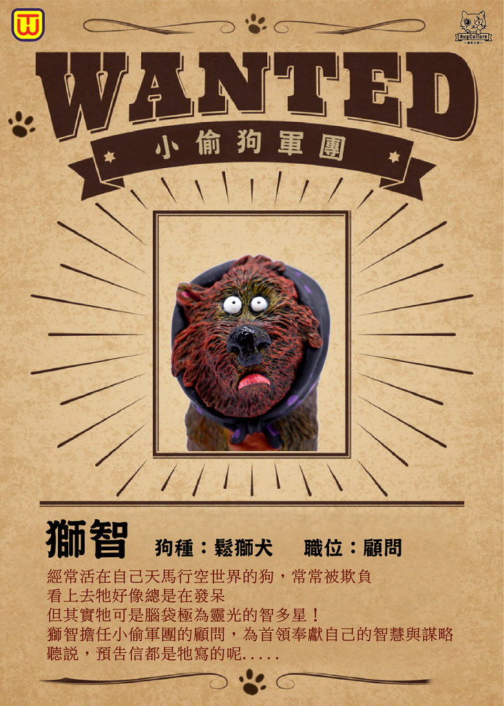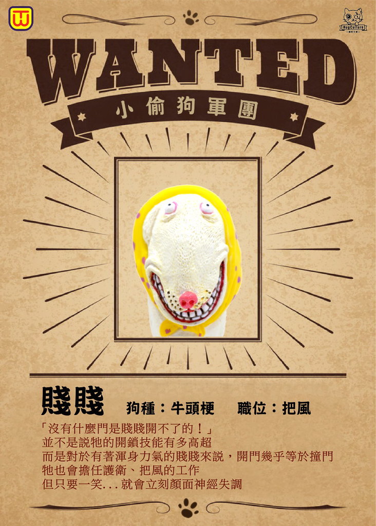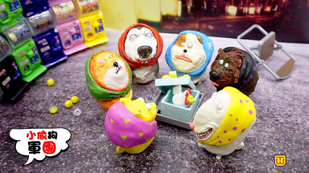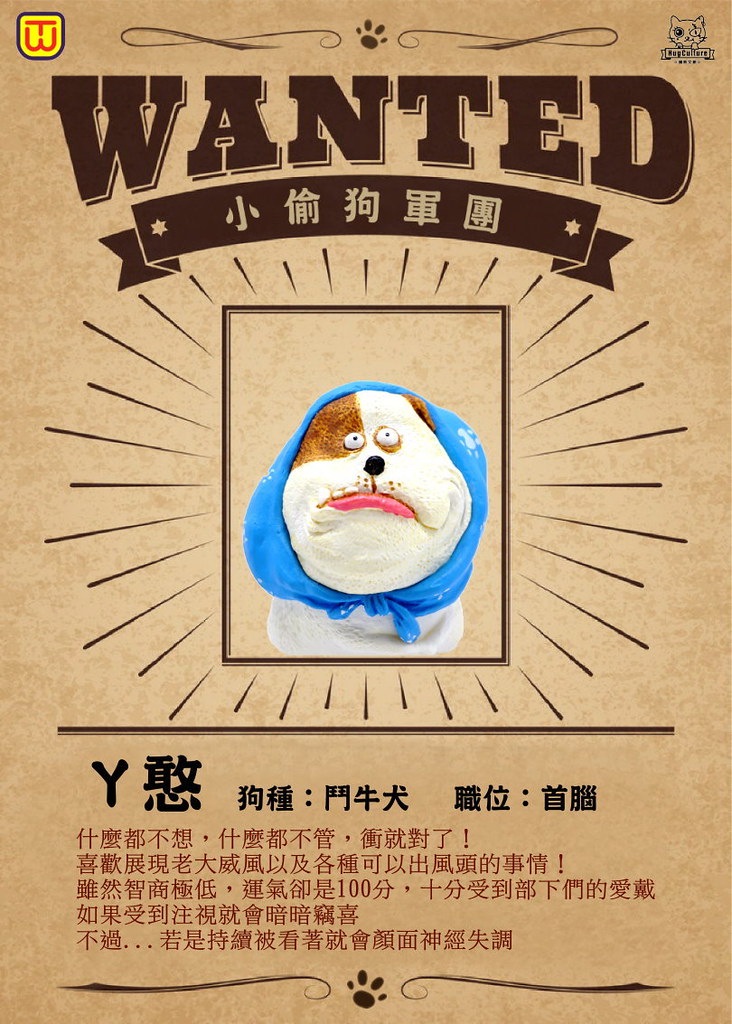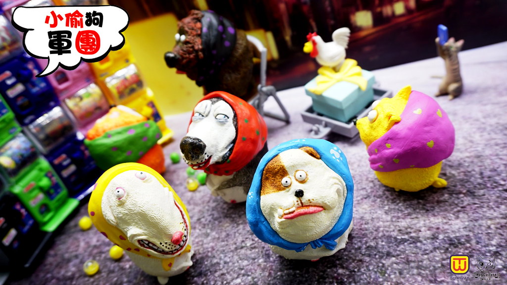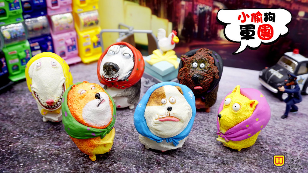 「小偷狗軍團」是擁抱文創與東匯玩具聯手推出的爆笑轉蛋作,一隻隻顏面神經失調的狗狗紛紛戴上小偷頭巾,身形古怪但動作迅速,專挑各位玩具人最寶貝的玩具跟荷包君下手,偷竊與掠奪是牠們的拿手好戲;據說,在詭計得逞時牠們還會露出極度狡詐、欠揍的笑臉然後揚長而去......。
