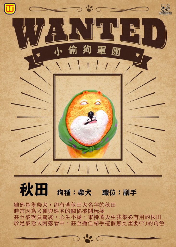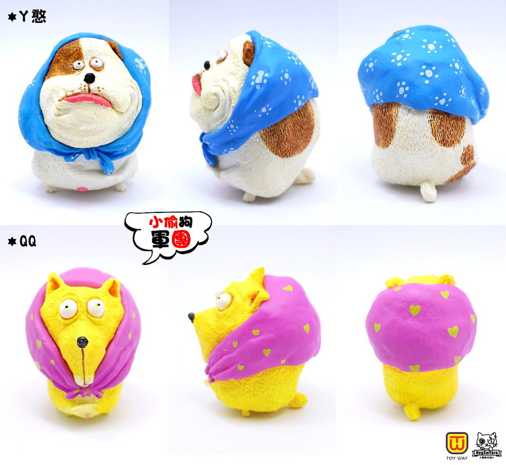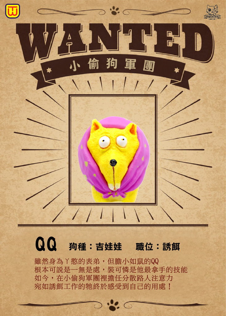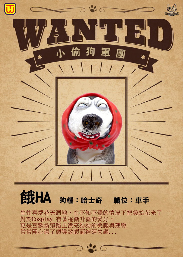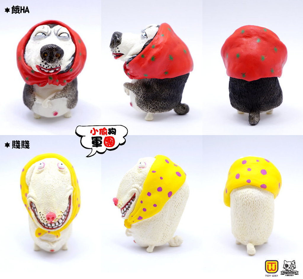 「小偷狗軍團」是擁抱文創與東匯玩具聯手推出的爆笑轉蛋作,一隻隻顏面神經失調的狗狗紛紛戴上小偷頭巾,身形古怪但動作迅速,專挑各位玩具人最寶貝的玩具跟荷包君下手,偷竊與掠奪是牠們的拿手好戲;據說,在詭計得逞時牠們還會露出極度狡詐、欠揍的笑臉然後揚長而去......。