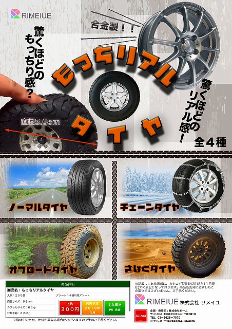日本創意產品公司RIMEIUE(株式会社リメイユ),以推出一些軟綿綿觸感的可愛商品(もちもちシリーズ)做為賣點,像是可以揉捏的軟軟麵包或小動物的紓壓小物,或是可以握在手上擠壓的…小輪胎?