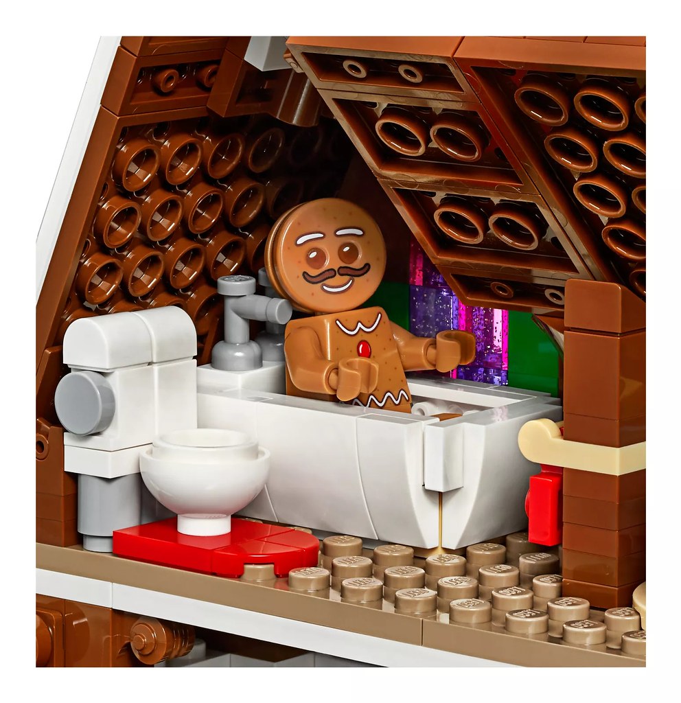 再來看看內裝部分,本次薑餅屋的傢俱、裝飾可說是療癒滿分,像是全新色的白巧克力磚所鋪成的床、櫃子的餅乾把手、棉花糖燈、嬰兒車的餅乾輪子,一樓有著色彩繽紛的地板、設置了發光磚與掛著聖誕襪的壁爐、可愛的全家福照片,二樓則是臥室,放了一個看起來很舒適的浴缸,還能把薑餅人寶寶放入嬰兒床;而為了更添節慶氛圍,本作也附屬了拼搭的小聖誕樹裝飾、各式禮物與玩具零件,搖搖馬好 Q 喔。