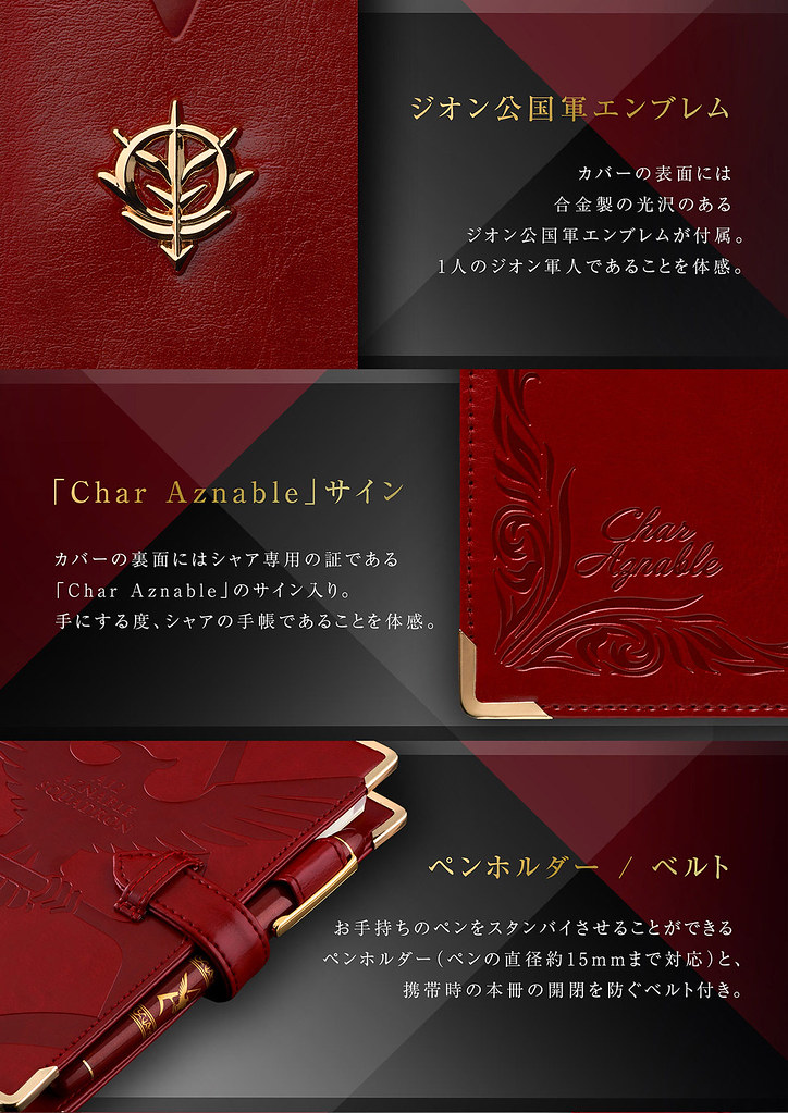 這款「夏亞專用手帳」光是從外型來看,就覺得其氣勢非凡啊!整體的主視覺用的就是最能代表夏亞的暗紅色,封面有老鷹的浮雕圖案,手帳的角邊緣有加以保護的滾金邊裝飾,當然更少不了吉翁的代表徽章,同樣也採用金色裝飾。光是外觀這樣看起來,就已經讓人感受到這款特製手帳的精緻度,實在不亞於一般的專業級手帳。