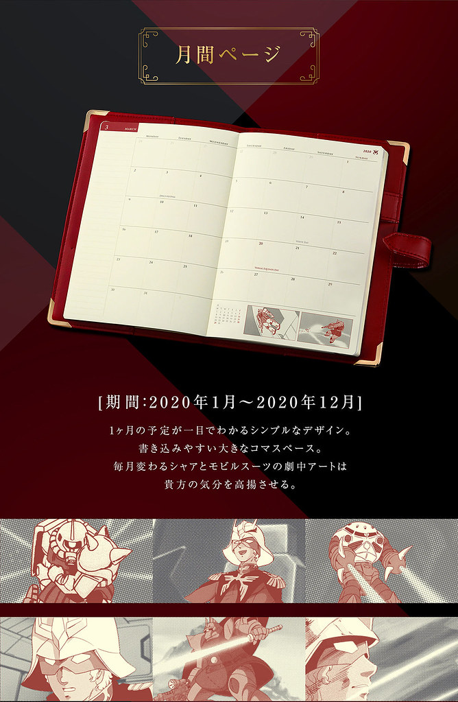 萬代 BANDAI 最近真的很文青,上次介紹過寫信寄信時用的專屬吉翁與夏亞樣式圖案的封蠟章,這次又推出了一款很棒的文具周邊,就是 2020 年版本的「夏亞專用手帳」(シャア専用手帳)!目前正在 PREMIUM BANDAI 線上商店展開預約中,預計從 2019 年 12 月的時候開始發售。