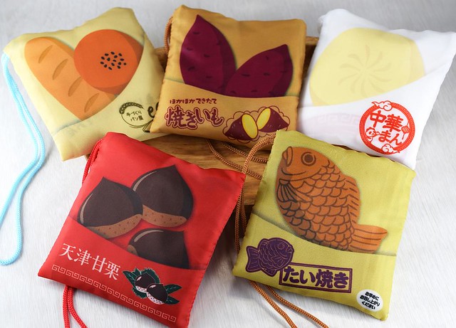 以日本街邊常見小吃為圖樣設計,像是烤番薯、鯛魚燒等,讓食物的包裝袋化身為環保提袋。轉蛋內除了一個尺寸為340mm×260mm的環保提袋以外,還有一個環保袋專用的收袋小方袋,可以將環保袋摺成小方型,方便攜帶;也可以將收納袋當成另外的小袋子使用,等於一顆轉蛋兩種滿足,這樣的設計真是既貼心又超值阿!