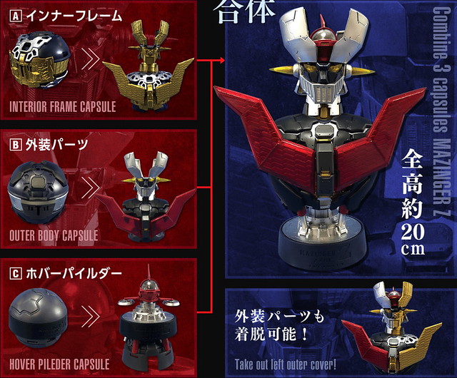 「INTEGRATE MODEL 無敵鐵金剛胸像」以柳賴敬之老師設計的 INFINITY 劇場版造型為基礎,使用全新開發的『轉蛋骨架構造』製作,蛋體本身即為組裝零件,分為骨架、外裝甲、指揮艇三部份,收集到三種後即可組裝出全高約 20 公分、擁有精美機械內構與裝甲細節造型的無敵鐵金剛胸像!