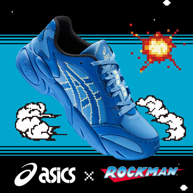 結合ASICS的GEL-BND運動鞋風格,這款鞋保留了傳統具影響力,參考了1998 年三項鐵人鞋的原創設計,和洛克人活蹦亂跳的印象相輔相成。以洛克人的經典配色呈現,並用光澤感材質作為鞋面,並將ASICSLOGO設計成8bit風格。鞋盒的圖樣是1987元祖洛克人卡帶遊戲的封面,散發出強烈復古味~洛克人迷應該會非常懷念!