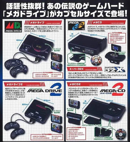 1988年誕生的SEGA Mega Drive,這台16-bit家用遊戲機是許多玩具人難以忘懷的童年~而這次的轉蛋就將當時的回憶濃縮成1/6的尺寸!超小型機體重現了原本的機關構造,主機本體、手把、機身貼紙和卡帶和光碟也都高度還原。雖然是復刻2004年推出的系列轉蛋,但使用全新的模具製作,整體細節大大升級!讓這款歷久不衰的遊戲機再次話題引爆。