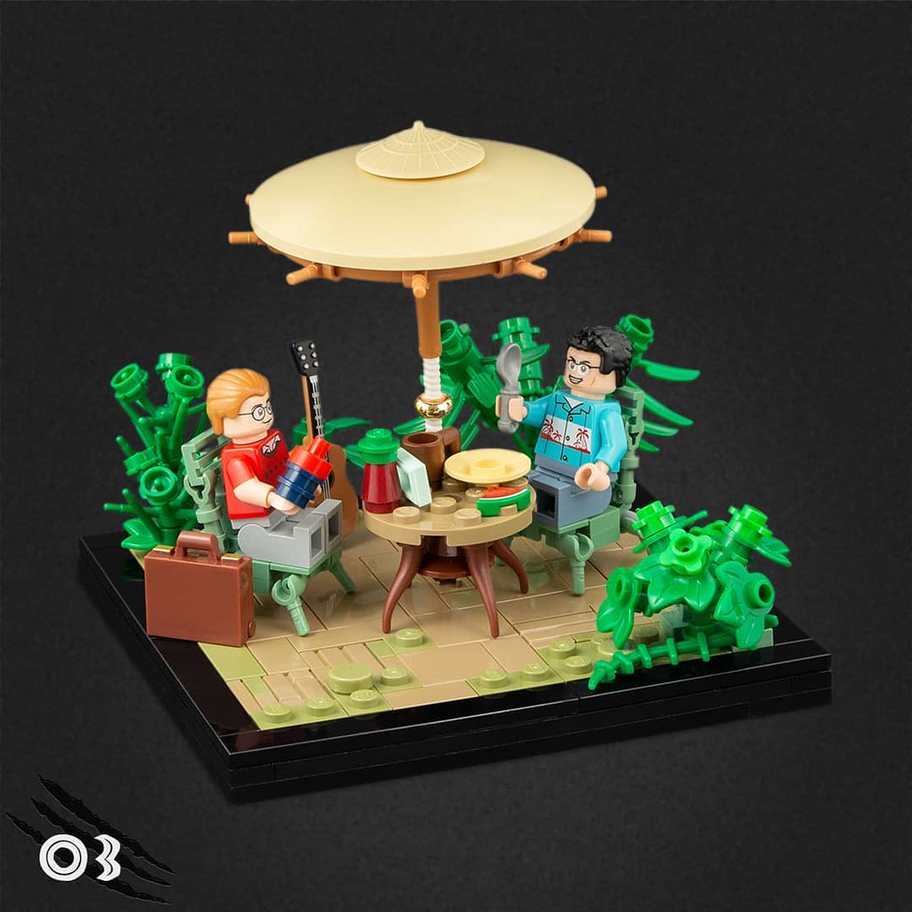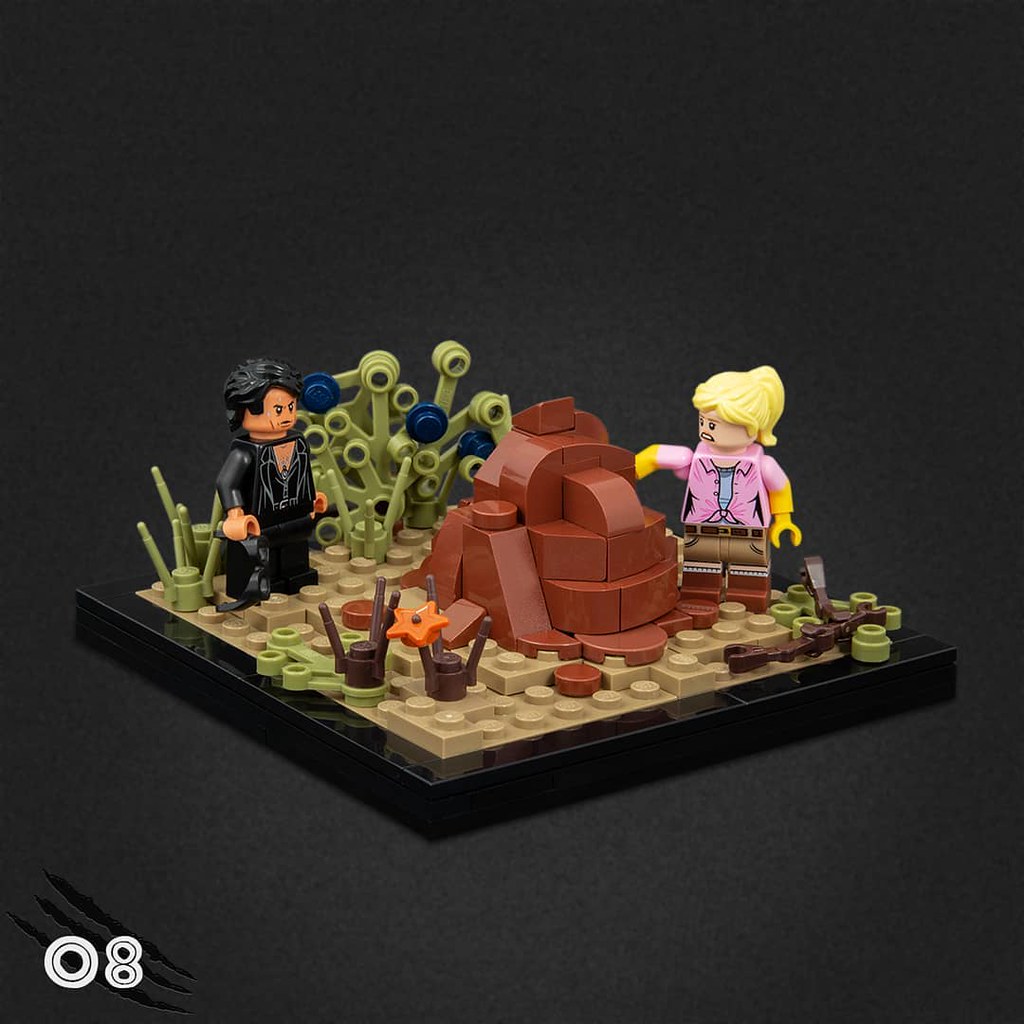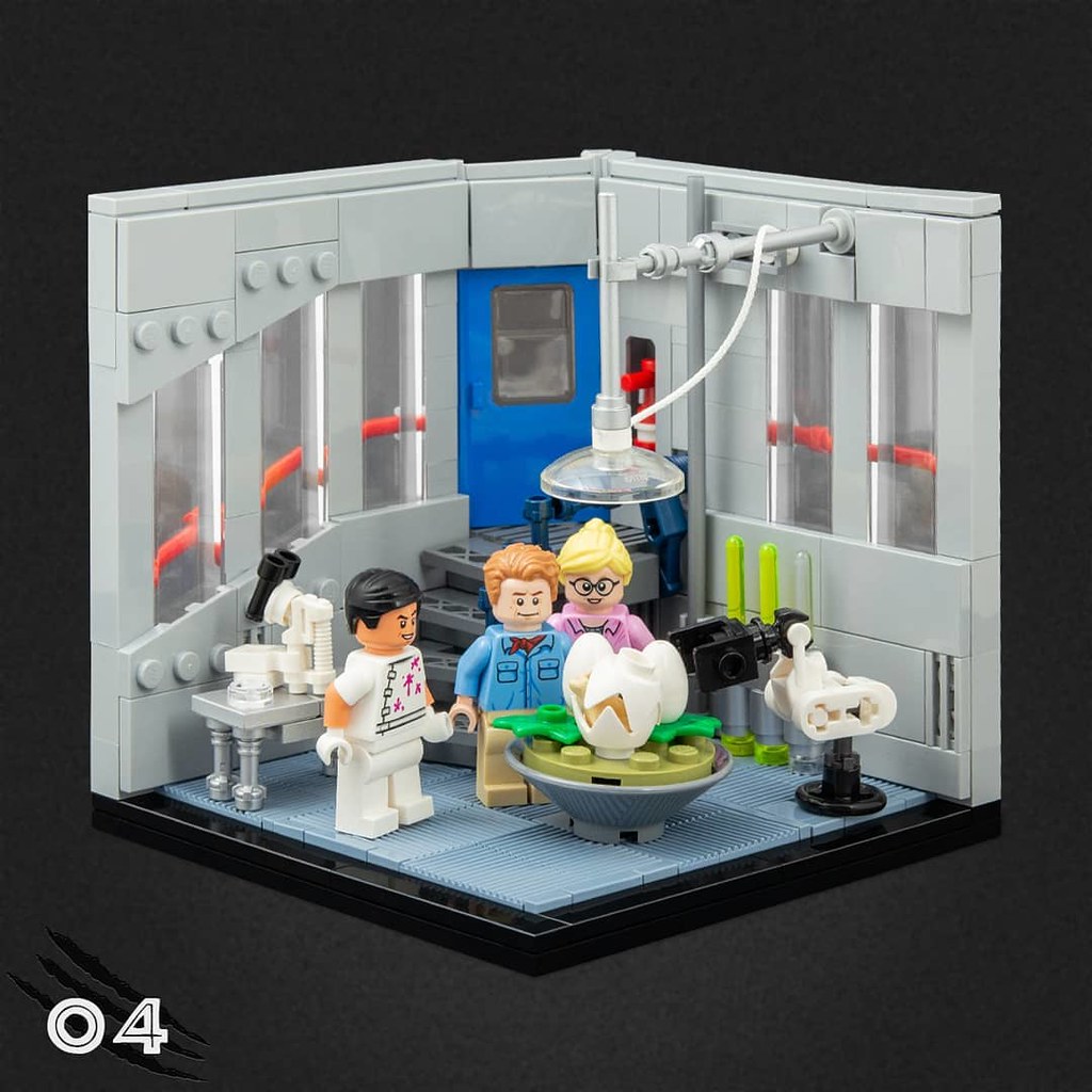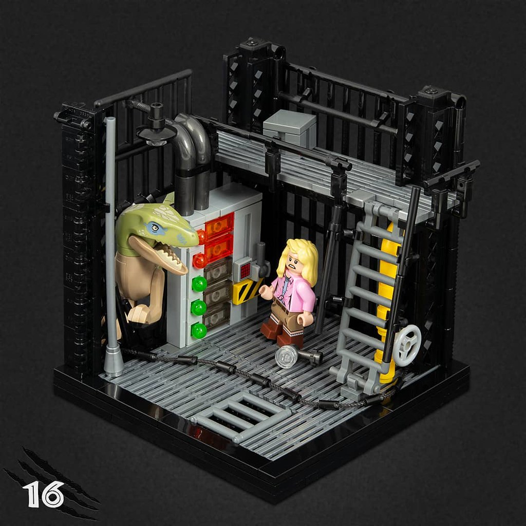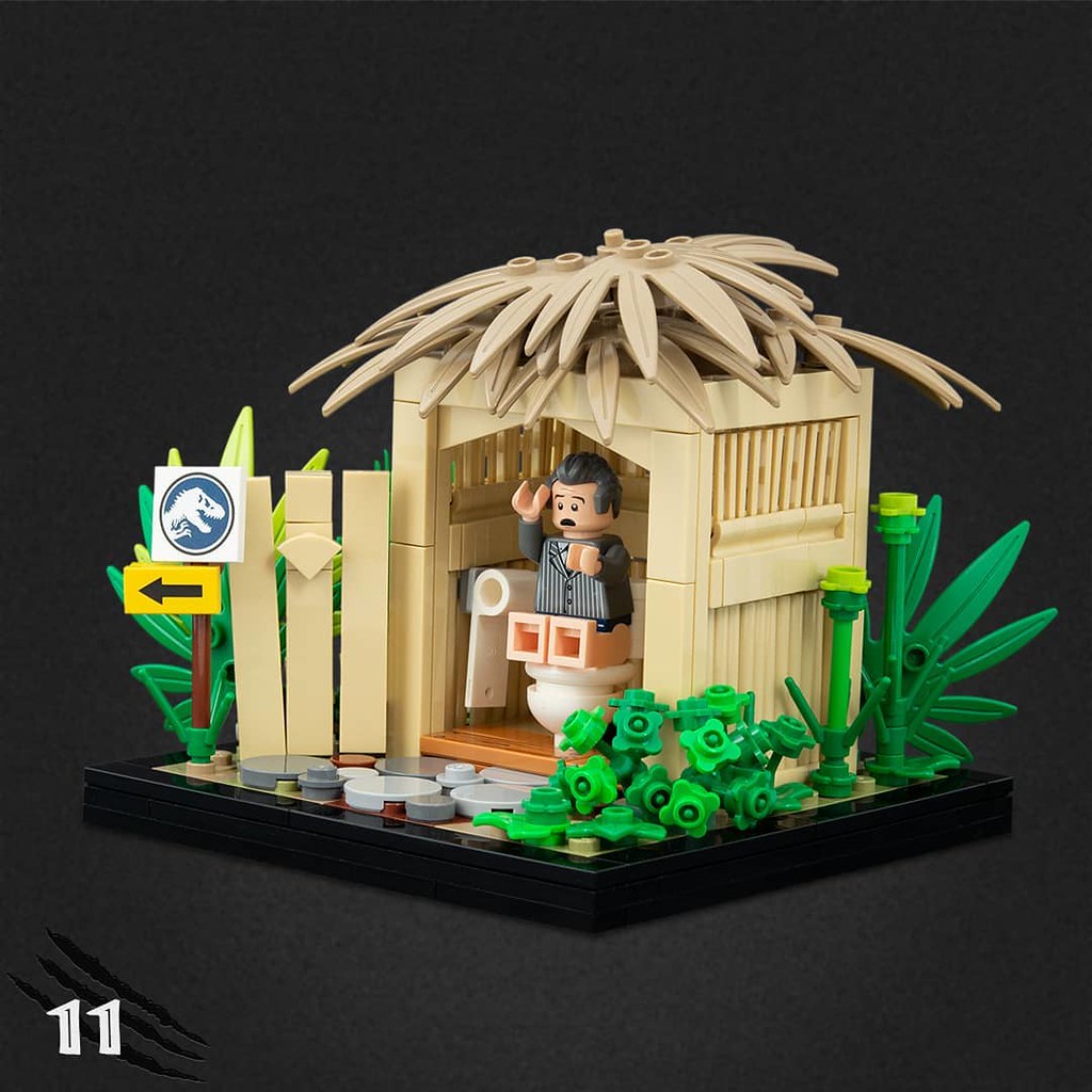 Jonas 在這系列創作裡除了運用之前官方盒組的角色人偶之外,他自組的沒穿褲子的律師唐納·卓那羅、亨利·吳博士也十分傳神,每個場景皆是以樂高人偶的比例去製作,在有限的空間內做出最能讓人想起劇中場景的要素並重新詮釋,包含實驗室設備、通電柵欄、遊園車、三角龍糞便......等,精彩萬分!