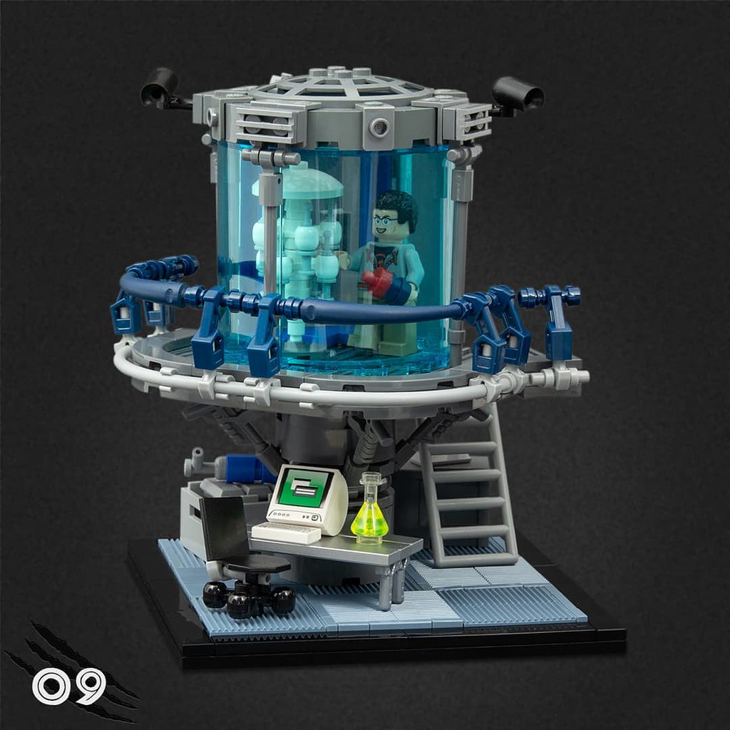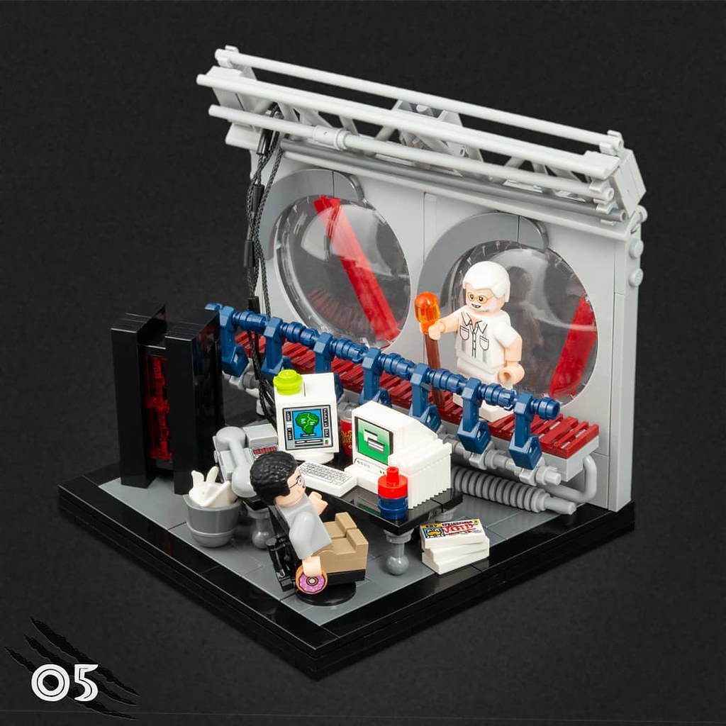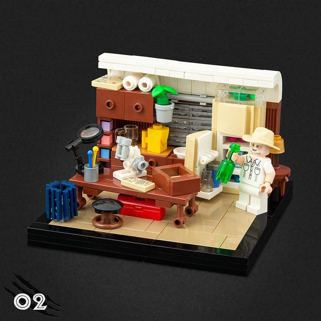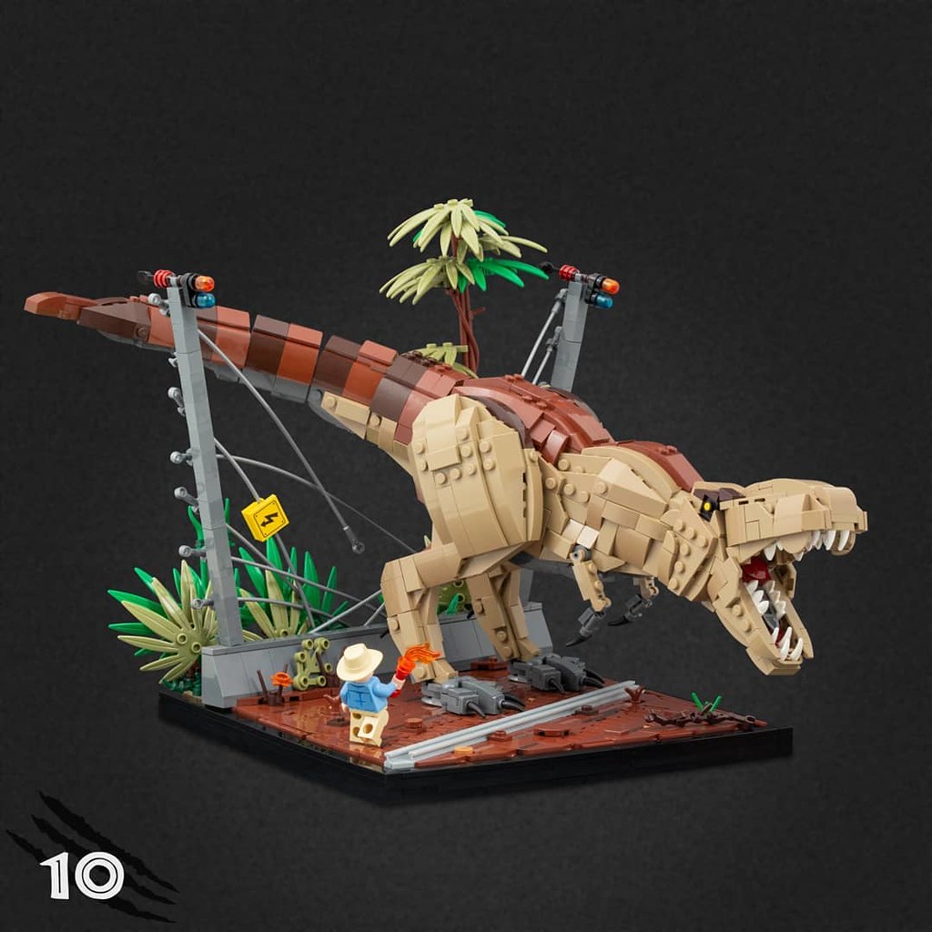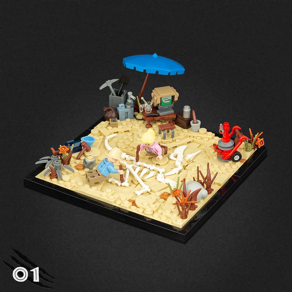 Jonas 在這系列創作裡除了運用之前官方盒組的角色人偶之外,他自組的沒穿褲子的律師唐納·卓那羅、亨利·吳博士也十分傳神,每個場景皆是以樂高人偶的比例去製作,在有限的空間內做出最能讓人想起劇中場景的要素並重新詮釋,包含實驗室設備、通電柵欄、遊園車、三角龍糞便......等,精彩萬分!