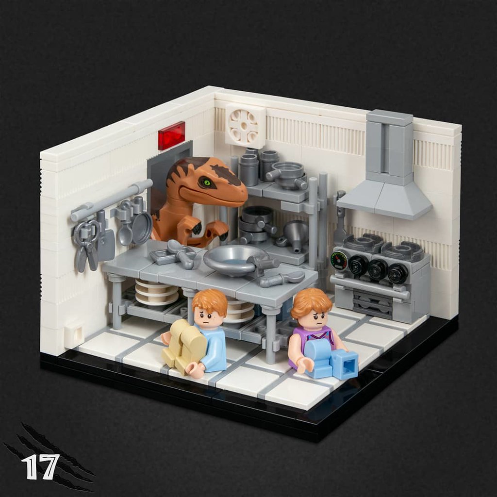 而 Jonas 這次的「Jurassic Jonas」系列創作即是想要表示「《侏羅紀公園》可不只有 T-Rex 跟公園大門」,像是迅猛龍與莉絲、提姆在廚房裡的捉迷藏,迅猛龍寶寶的孵化,生病的三角龍,胖子丹尼斯·納德利偷胚胎與被毒液噴滿臉的瞬間,以及霸王龍衝破柵欄、片尾怒吼的場面!