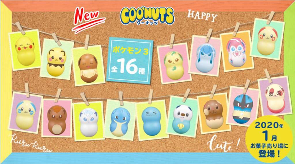 由日本萬代公司旗下食玩事業部「BANDAI CANDY」推出的COO'NUTS(クーナッツ)系列宣布將推出超人氣《精靈寶可夢》(ポケモン)不倒翁轉轉花生第三彈!全 16款,預計於 2020年 1月在日本販售。