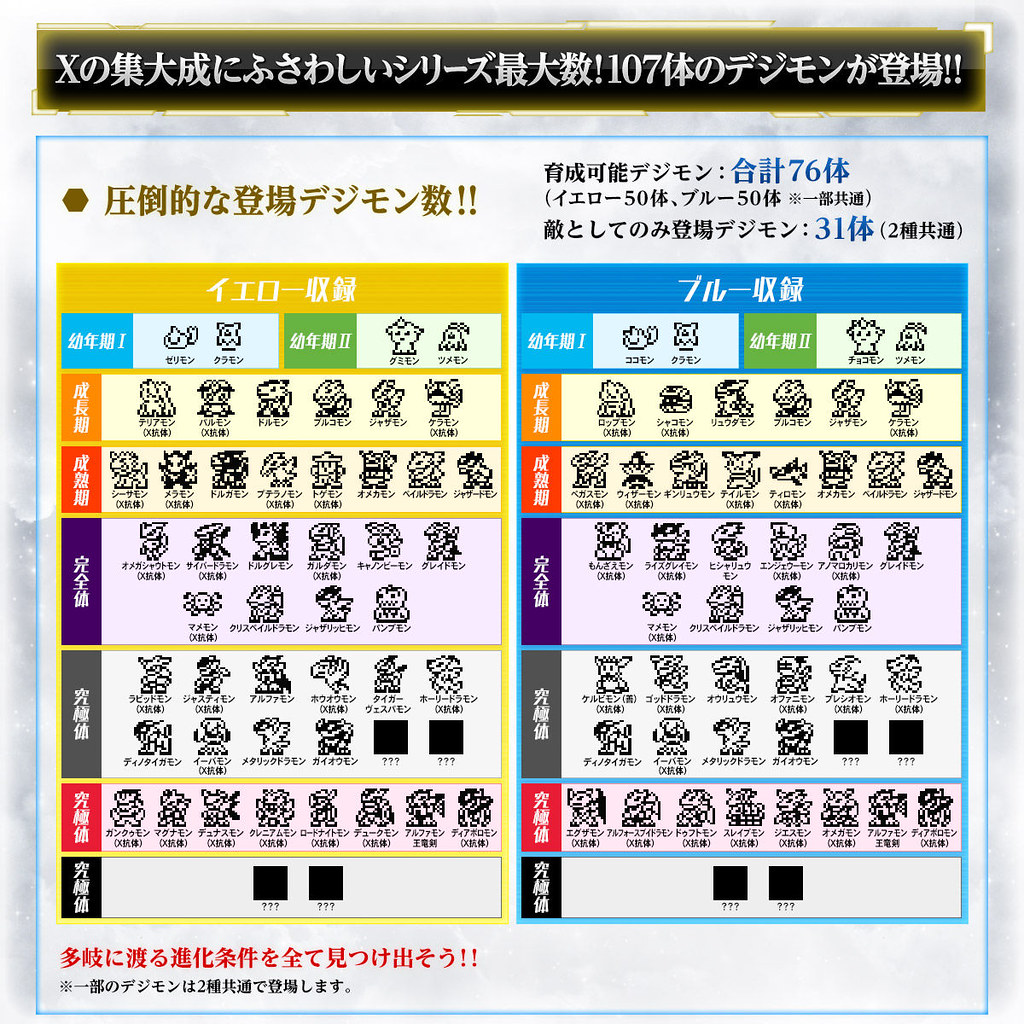 可育成數碼寶貝達76隻(黃款50隻、藍款50隻※部分共通),敵方數碼寶貝也有31隻,系統最多可以儲存兩隻數碼寶貝的育成狀態。