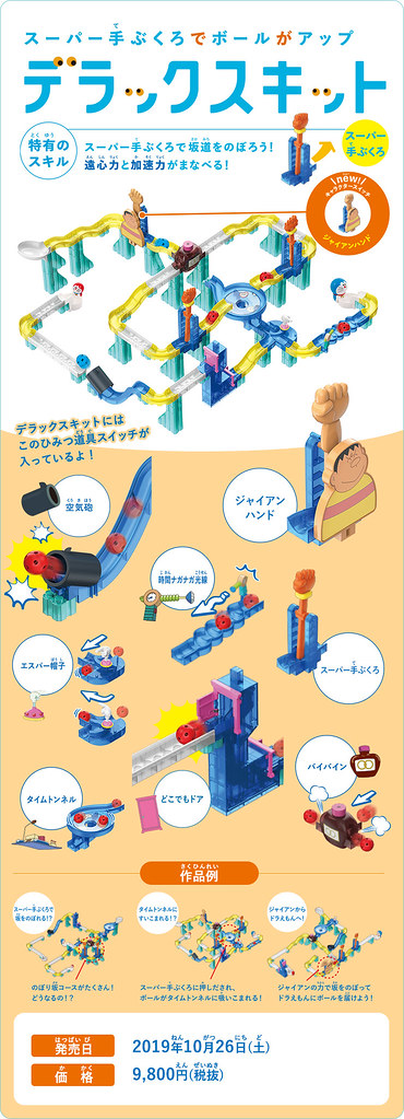 繼日本萬代BANDAI玩具公司於六月獲獎好評發售的 2 款「哆啦A夢秘密道具軌道積木(ころがスイッチ ドラえもん)」之後, 10月又將再推出「哆啦A夢秘密道具軌道積木 DX版」(ころがスイッチ ドラえもん DXキット),除了前款的「空氣砲」、「格列佛隧道」、與「超能力帽」等道具以外,又追加新道具:胖虎造型的「超級手套(スーパー手ぶくろ)」!預定於10月下旬販售。