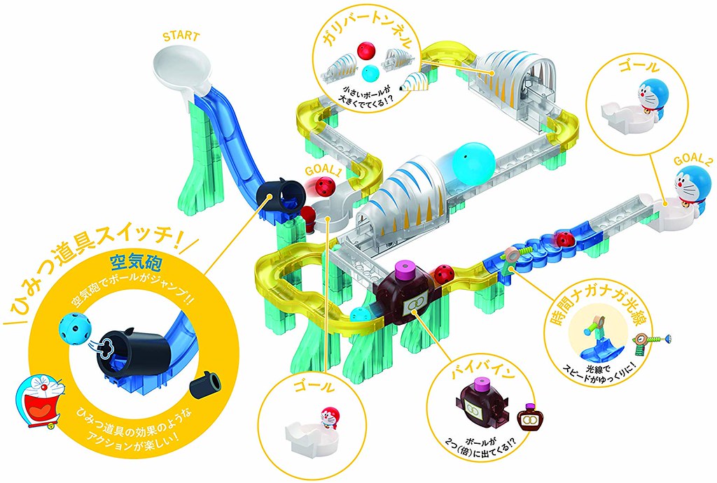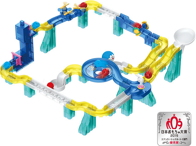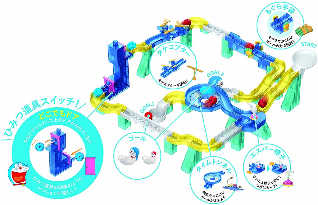 「哆啦A夢秘密道具軌道積木」將《哆啦A夢》中的祕密道具結合至「魯布·戈德堡機械」中,不使用電力,僅透過機械動力運作的一款桌上型益智遊戲。
