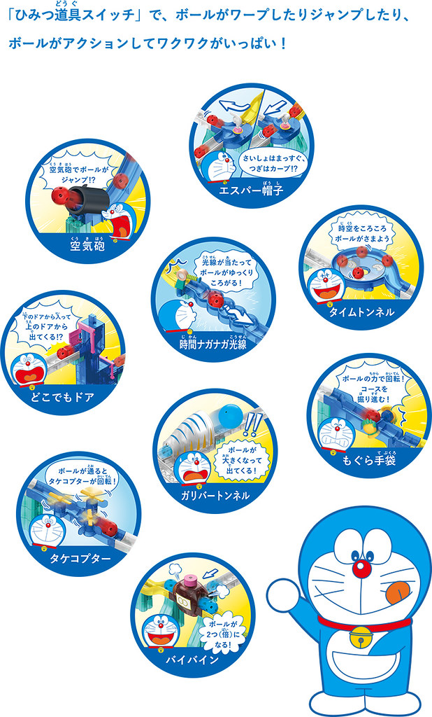 玩家的目標是妥善地利用方塊、軌道與秘密道具轉轍器等零件打造出一條完美路徑,順利把球送給哆啦A夢就算任務完成!在遊玩過程中不斷設計組合、測試、修正,不只能激發玩家的想像力與創造力,也能培養集中力、空間認知力、耐心等,不愧為榮獲 2019 年日本玩具大賞智育玩具部門優秀賞的作品。