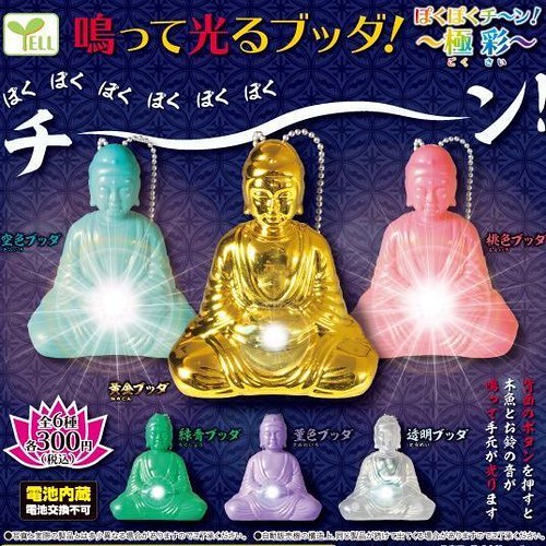 專門推出趣味轉蛋的日本玩具廠牌YELL(エール)又將推出一款超鬧的產品「響亮而閃亮的佛陀!叩叩叮!」(鳴って光るブッダ!ぽくぽくチーン!),以慈祥的佛陀作為主題的吊飾轉蛋,一共有六種顏色,一轉300日幣,預計2019年12月發售。