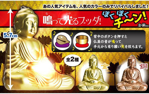 「響亮而閃亮的佛陀!叩叩叮!(鳴って光るブッダ!ぽくぽくチーン!)」系列先前已經推出過兩代了,第一代兩款金、銅色推出後大受好評,第二彈加碼推出綠青與漆黑兩款(共四款)!而這次推出的極彩系列則有別於前兩代的古樸色調,讓佛陀多了繽紛可愛的配色,走出佛陀新風格。