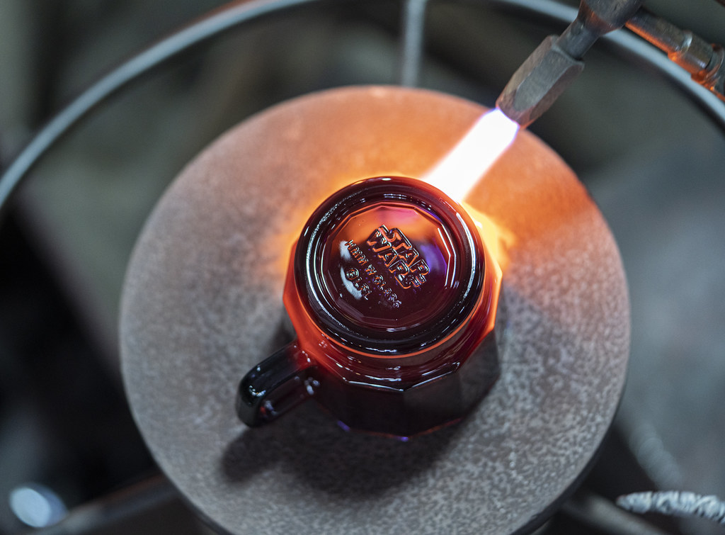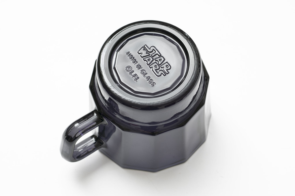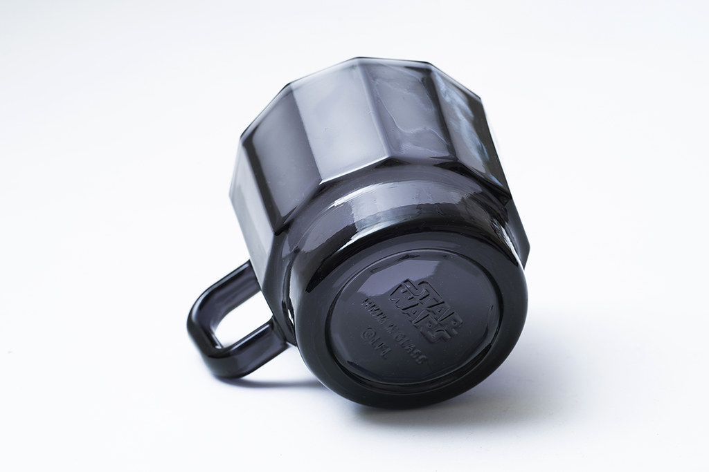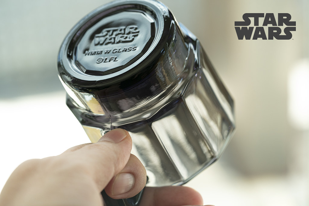 星際大戰黑武士特別版玻璃杯,是由本土資深職人用窯爐將玻璃加熱到攝氏 1400 度,讓玻璃呈現液態膏狀後,採壓鑄的方式手工生產。在炙熱的高溫之下,將廢棄的玻璃原料逐步型塑成精美的日常用品。呼應了生生不息的設計概念,將時鐘的刻度轉化成杯身的十二面優雅稜角,並運用玻璃染色工藝,賦予熟成的黑色,在各種角度都能有不同的光澤變化,加上一體成形的防燙把手,實用度再升級。