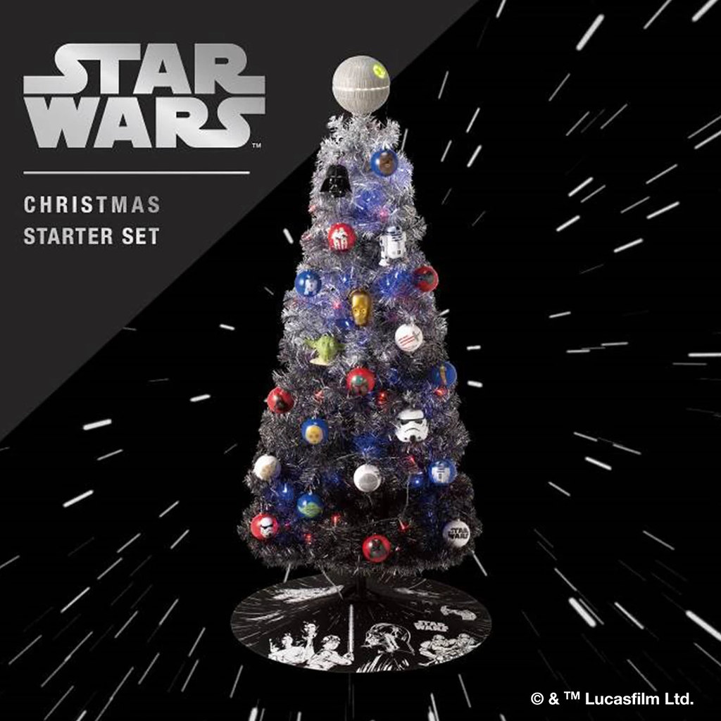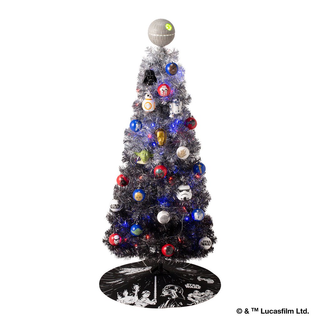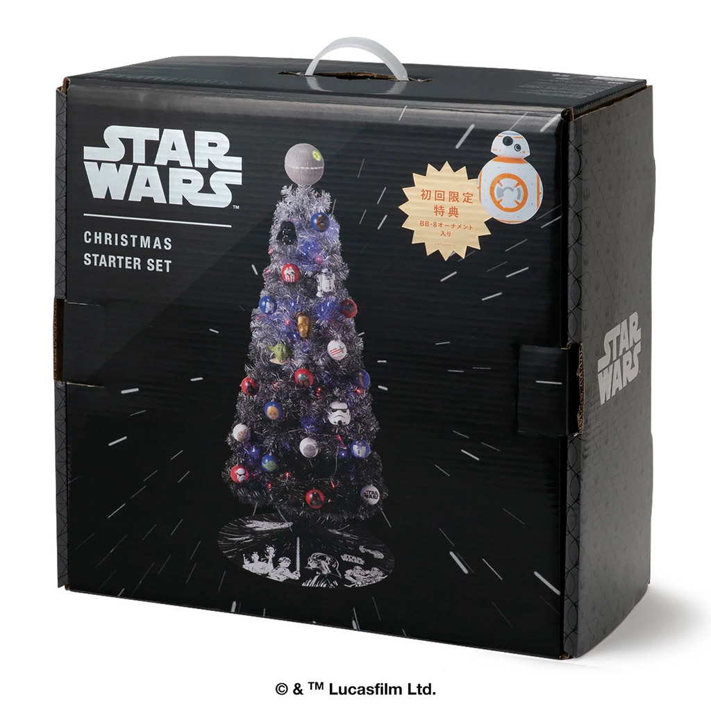 樹體設計為銀白至黑色漸層,就像繁星閃爍的銀河系。聖誕樹頂部則用銀河帝國製造的終極武器-死星(Death Star)裝飾取代原本的樹頂星;除了16顆印有星戰圖案的圓球掛飾,還有立體的經典角色掛飾:尤達、C-3PO、黑武士、R2-D2、帝國風暴兵,以及初回限定版才有的BB-8,共六款,可以隨心擺掛,裝飾屬於自己的星戰聖誕樹。