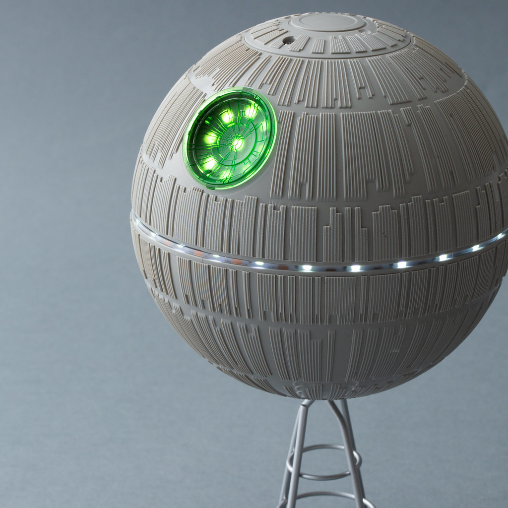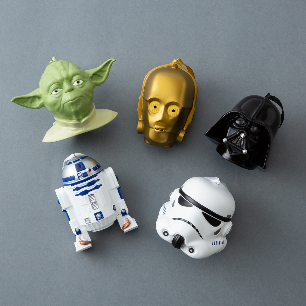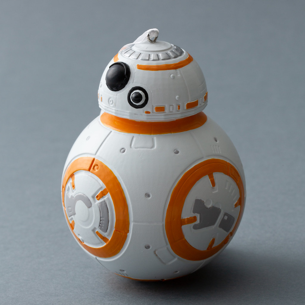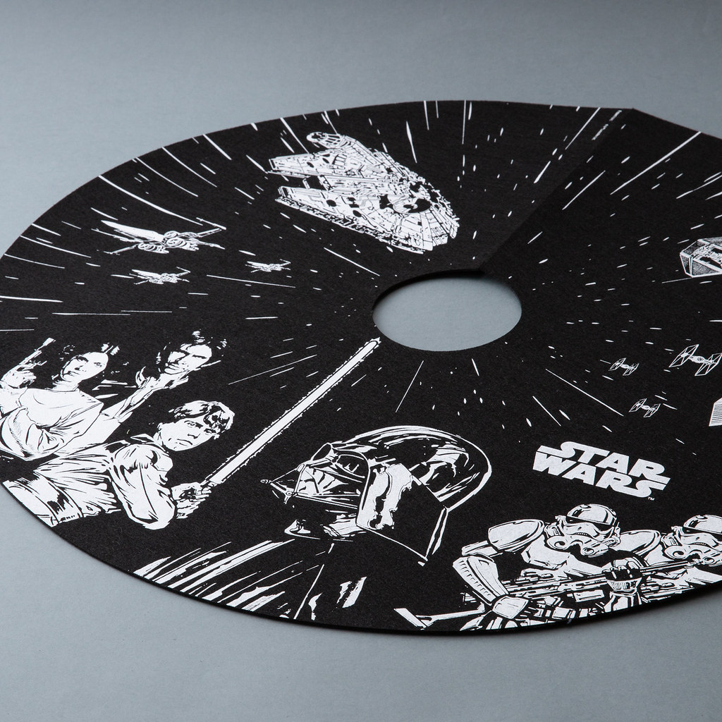 樹體設計為銀白至黑色漸層,就像繁星閃爍的銀河系。聖誕樹頂部則用銀河帝國製造的終極武器-死星(Death Star)裝飾取代原本的樹頂星;除了16顆印有星戰圖案的圓球掛飾,還有立體的經典角色掛飾:尤達、C-3PO、黑武士、R2-D2、帝國風暴兵,以及初回限定版才有的BB-8,共六款,可以隨心擺掛,裝飾屬於自己的星戰聖誕樹。