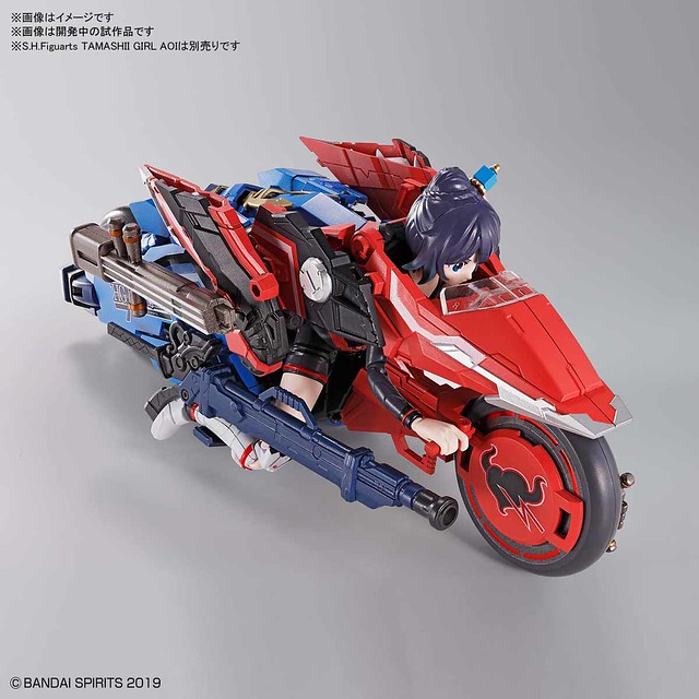 接下來則是讓「合作」要素滿點的巧妙合體變形設計,兩款商品竟然能夠合二為一,組成一架超帥重機!而且還能變換兩種型態,其一是以蒼流丸為主體的完全重機型態,其二則是以 TAMASHII GIRL AOI 為主體的騎乘型態,有趣的設計讓人十分期待呀!商品全貌將在 2019 年 09 月 27 日~29 日舉行的『第59回全日本模型 HOBBY SHOW』中展出。