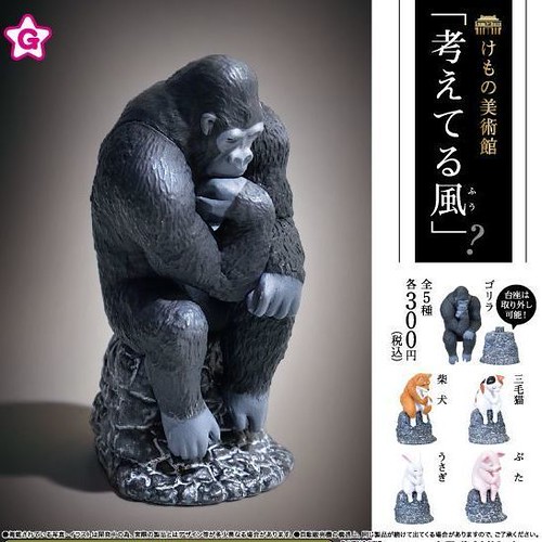 專門推出趣味轉蛋的日本玩具廠牌YELL(株式会社エール)延續著超鬧的風格,即將推出「動物美術館 沉思者」(けもの美術館「考えてる風」)轉蛋,一共五款,分別是五隻向世界知名的雕塑「沉思者(Le Penseur)」致敬的動物,一轉300日幣,預計於 2020年 1月發售。