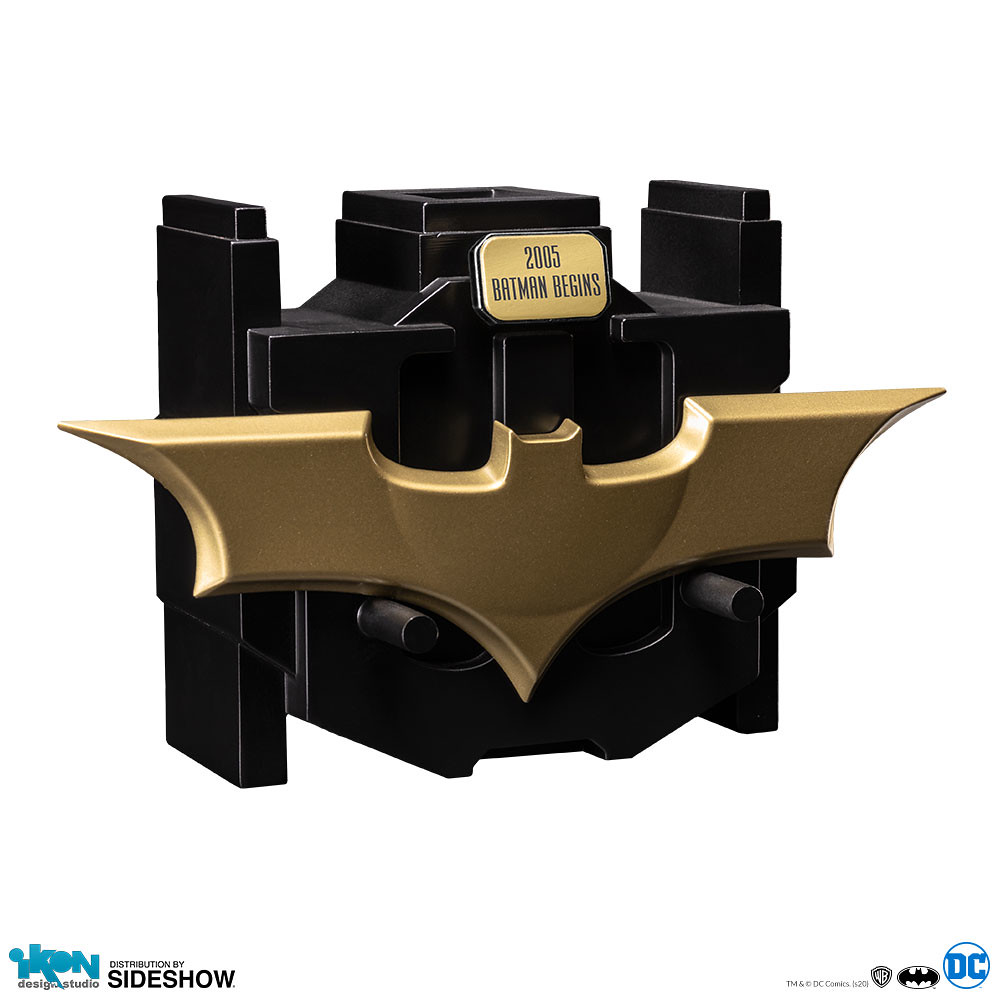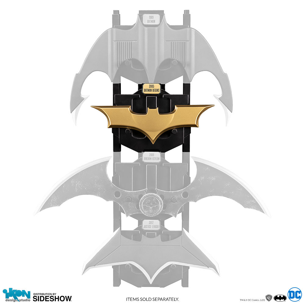 Ikon Design Studio 這次推出的蝙蝠飛鏢道具複製品共有四款,分別是 1989 年的提姆·波頓版《蝙蝠俠》、2005 年的《蝙蝠俠:開戰時刻》、2009 年的電玩《蝙蝠俠:阿卡漢瘋人院》,以及 2017 年的《正義聯盟》。這次的《開戰時刻》版金屬蝙蝠飛鏢長度來到 17.4 公分,再現了尖銳、俐落的造型,並施以亮眼的金色塗裝,除了蝙蝠飛鏢本體,還有印製了 2005 BATMAN BEGINS 字樣名牌的展示支架,由 Ikon Design Studio 釋出的官圖能得知這四款蝙蝠飛鏢的支架能夠結合起來共同展示,實在令人心動!