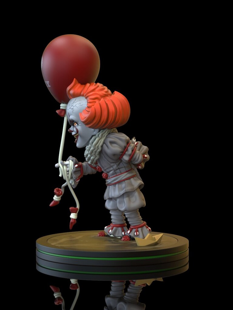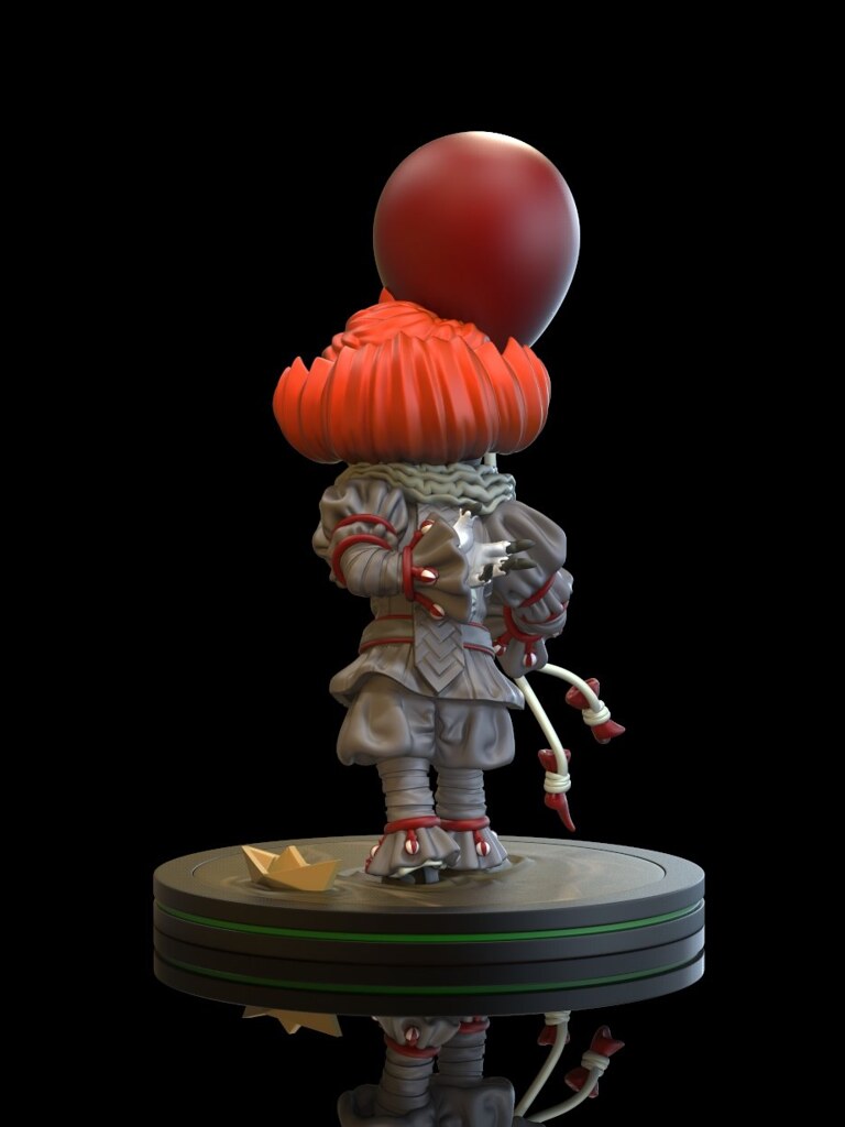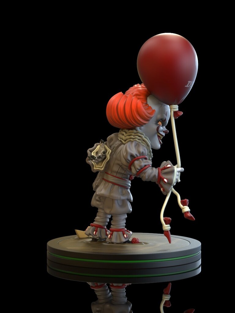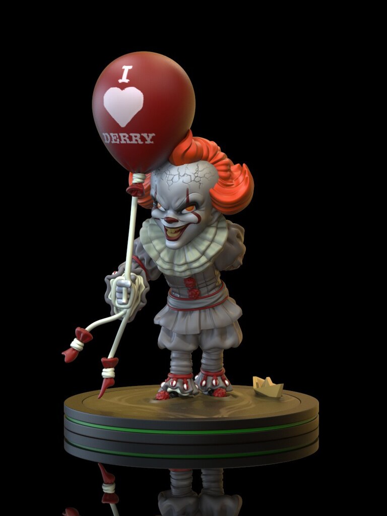 「Q-Fig 潘尼懷斯」高約 15.4 公分,其面部表情的形塑實在非常嚇人!除了一貫滿滿惡意的詭異笑容之外,上吊的橘色雙眼更似乎要持續地往外擴張,搭配假意拿著氣球誘騙小孩、但藏在背後的左手早就伸出利爪的動作,這表情彷彿傳達了「『牠』已經無法按耐想吃人衝動」的狀態,搶眼的紅色氣球印製了「I ❤ DERRY」,小丑戲服的荷葉型領飾與袖口,以及泡泡袖、紅色絨球等細節也高度還原,底座則營造出水面的環境,還有小紙船漂著呢!