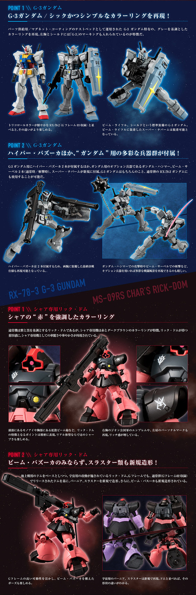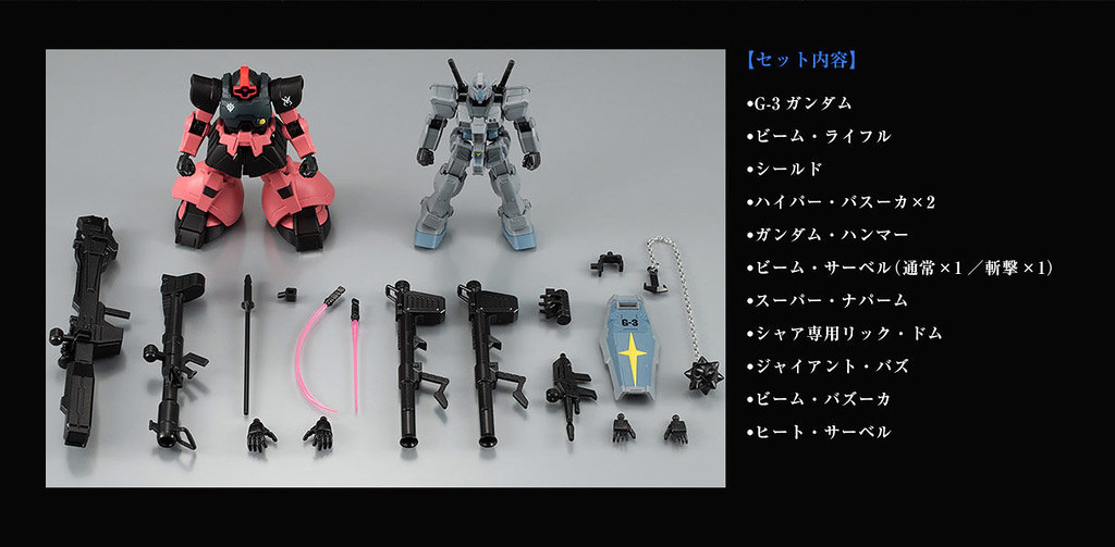 本次推出的兩款 G-FRAME 機體,都有特別把和原始版本的差異之處做出來,例如夏亞專用里克‧德姆和一般的里克‧德姆相比,其背後的推進器就特別大些(宇宙用),另外手持的光束火箭炮也是新規配件。而 G-3 鋼彈與普通的 RX-78-2 鋼彈相比,除了全體灰色調的塗裝之外,附屬的武器多了一挺火箭炮、以及可以裝在光束來福槍身上的超級燒夷彈發射器。