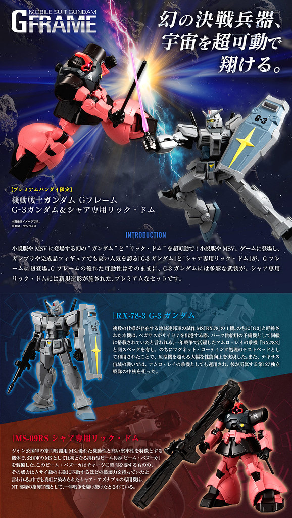 由日本萬代 BANDAI 公司旗下的食玩事業部「BANDAI CANDY」所發行的「機動戰士鋼彈 G-FRAME」(機動戦士ガンダム Gフレーム)系列,其導入骨架概念之設計,讓該系列大受歡迎,這兩日適逢全日本模型展,萬代也推出該系列最新商品,來自《機動戰士鋼彈》小說裡面的人氣夢幻機體:「夏亞專用里克‧德姆」(シャア専用リック・ドム)以及很常在遊戲中登場的「G-3 鋼彈」(G-3ガンダム),預計將在 2020 年 1 月發售。