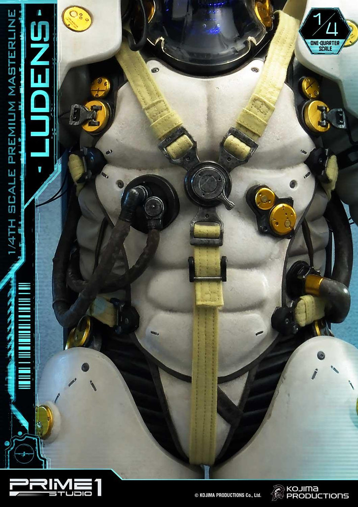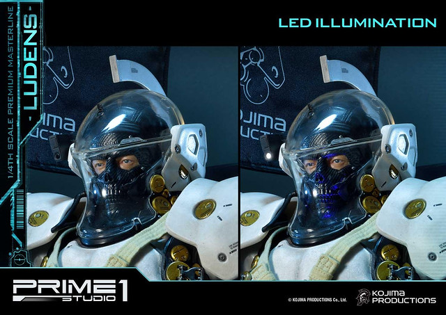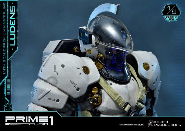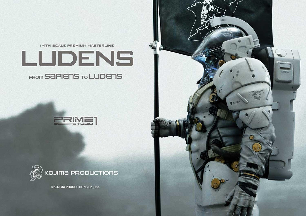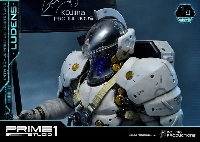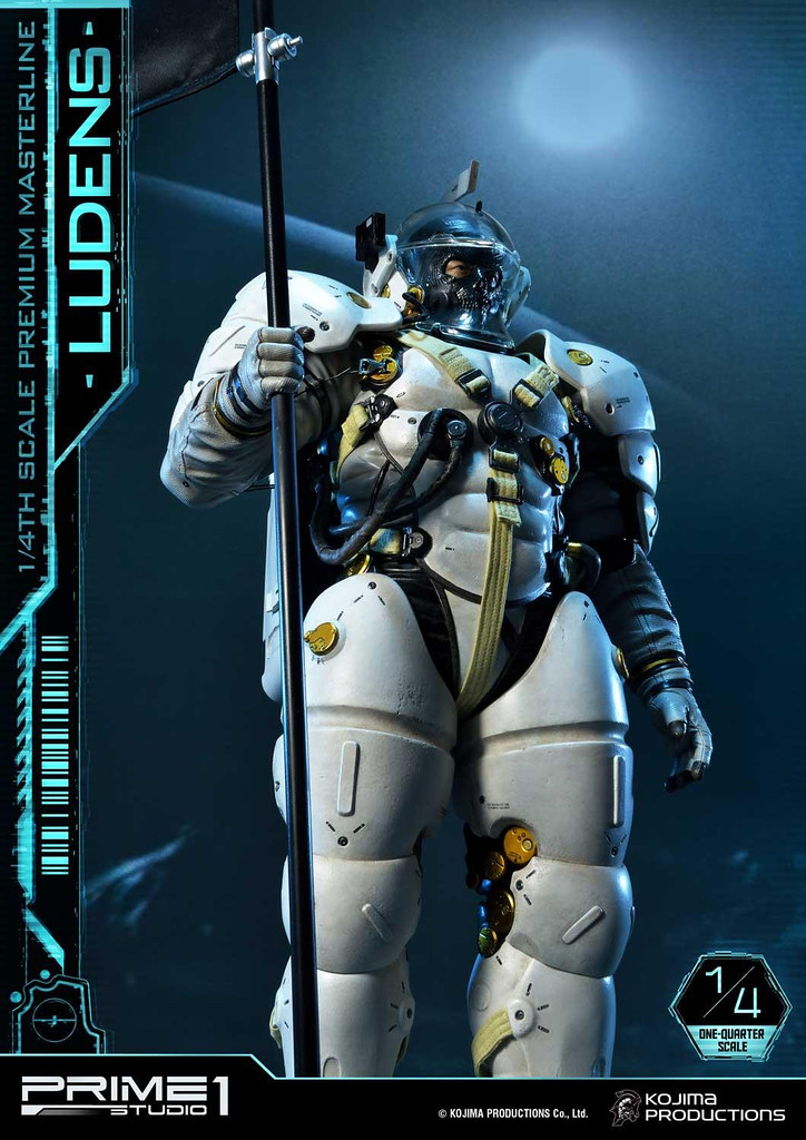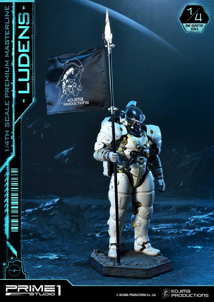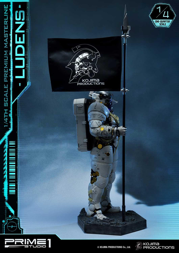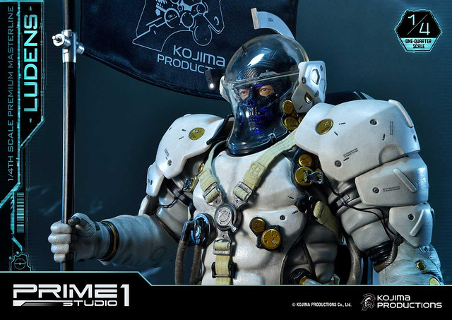 「Premium Masterline Ludens 1/4 比例雕像」整體造型與 1/2 比例版本相同,由小島製作完全監修,以設計時使用的 3D 模型為基礎,精密再現充滿科技感的太空服,各部位材質的紋理,色澤相當寫實並帶有舊化效果。手中立起懸掛「小島製作」LOGO旗幟的槍旗,彷彿宣告小島製作的重生以及新作《死亡擱淺》將為遊戲業界帶來衝擊。