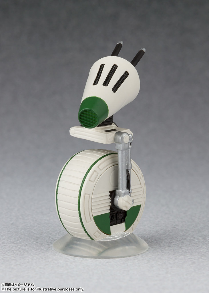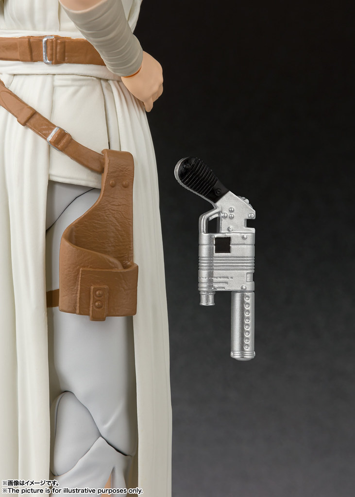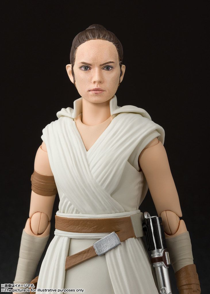 本次的芮再現了預告裡一襲白色衣裝的造型,運用數位塗裝(デジタル彩色)技術在約 2 公分的尺寸裡描繪出演員「黛西·蕾德莉(Daisy Ridley)」的面龐,還附上了可自由拆卸的白色兜帽零件,武器配件包含藍色光劍、未開啟的光劍柄、連背帶長棍,以及爆能槍,另外,還有將在 EP9 登場的全新機器人「D-O」喔。