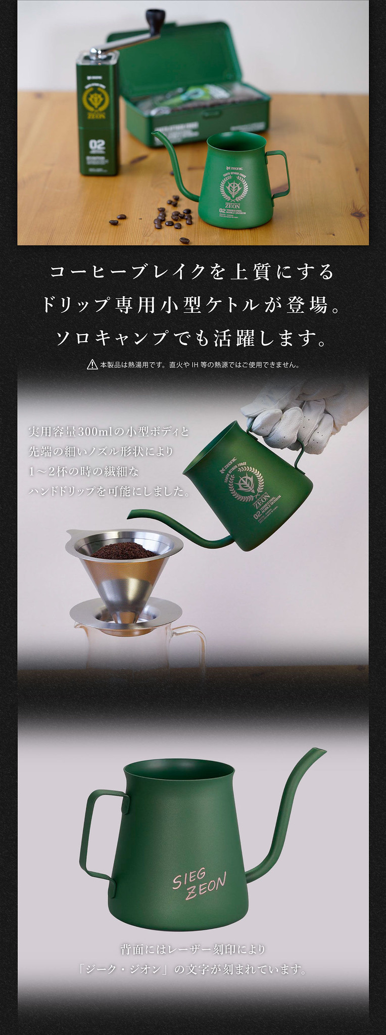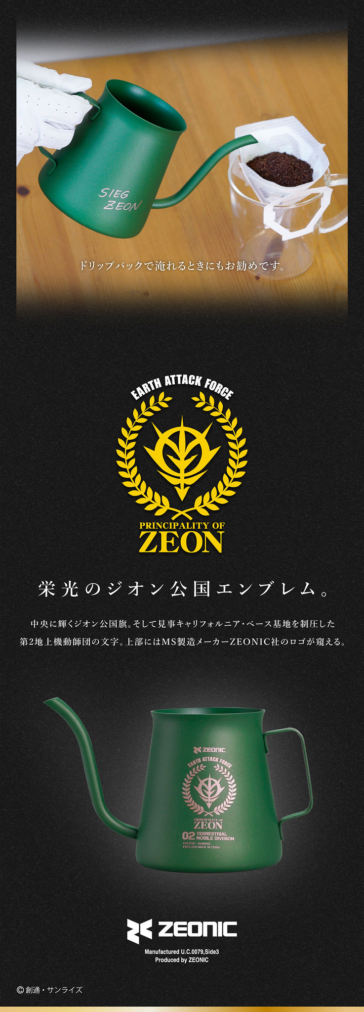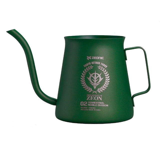 手沖咖啡壺的容量約 300cc,一側除了有吉翁軍的軍徽章圖案,以及寫著「EARTH ATTACK FORCE」等字樣之外,在壺身的另外一側還有著彷彿是手寫的「SIEG ZEON」(吉翁萬歲)的字樣,簡直就像是個不知名的吉翁士兵的隨身物,更有幾分戰爭感。