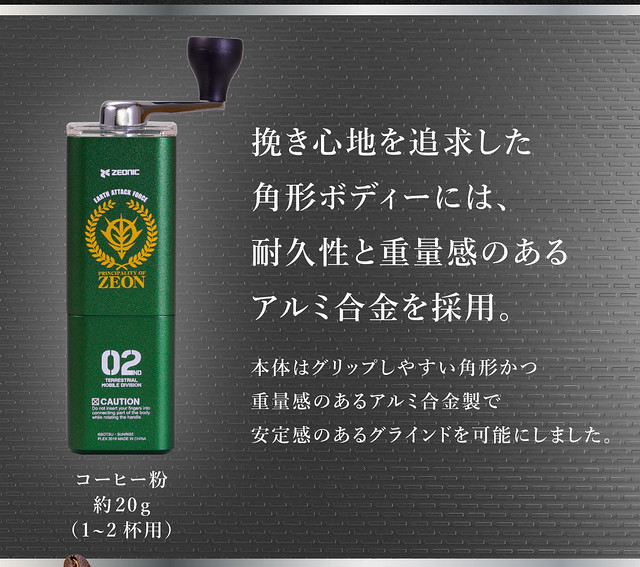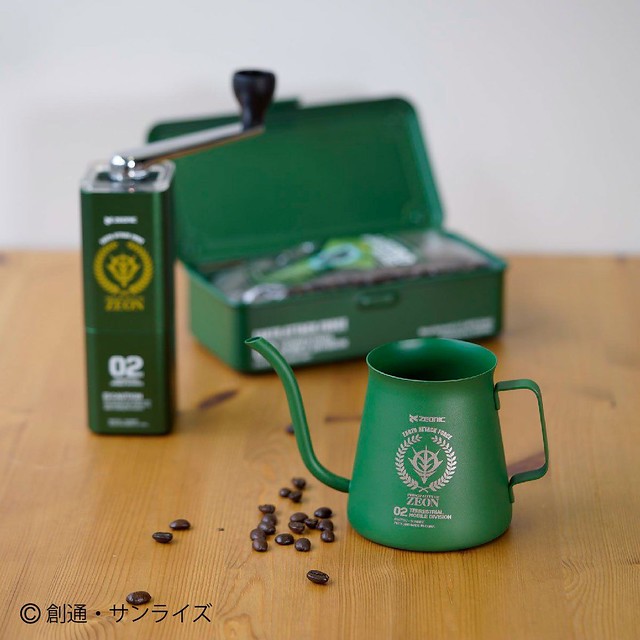 最近的萬代 BANDAI 真的是越來越文青了,出了蠟封章、手帳之後,現在就連喝咖啡這件事情也能很吉翁!日本萬代的子公司 PLEX(プレックス)推出以吉翁軍的代表色:草綠色,製作而成的個人手搖式咖啡豆研磨器,和搭配的手沖咖啡壺,預定在 2019 年 12 月發售。