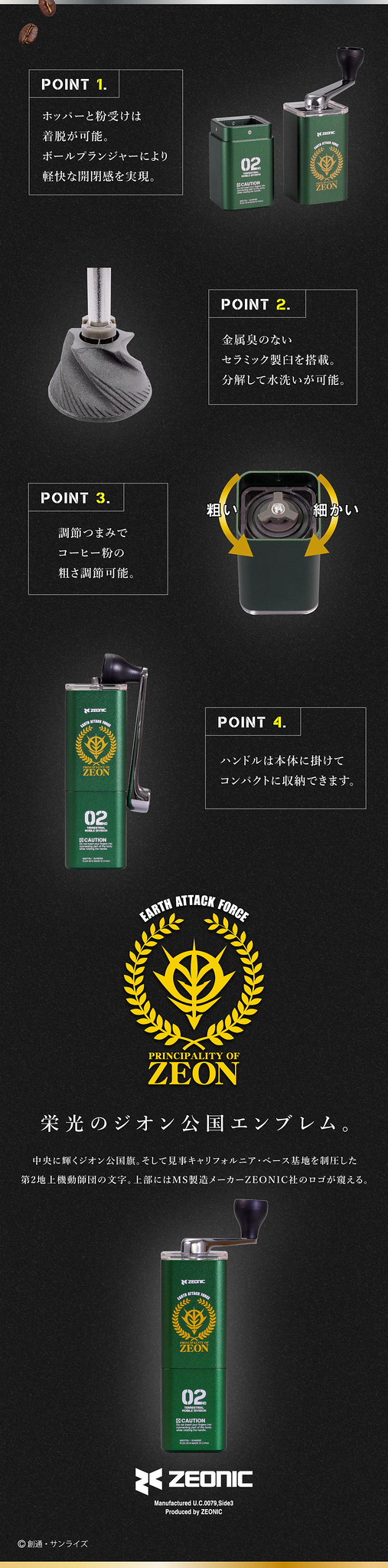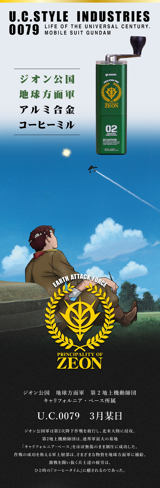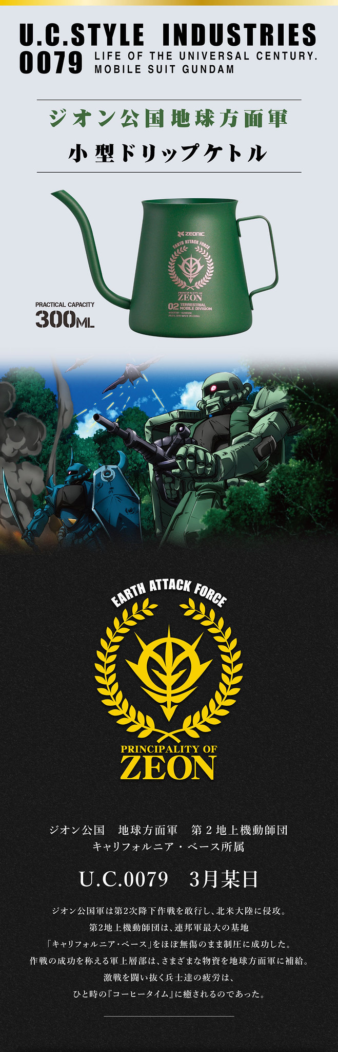 這兩款商品的外觀風格,採用的是最能夠表現出吉翁軍的草綠色,而且一看就會覺得,這是代表地上部隊的顏色,沒錯,這兩款商品的名稱前面都有「吉翁公國地球方面軍」(ジオン公国地球方面軍)的字樣,似乎可以想見,這兩款產品是吉翁軍的士兵們在征戰途中空閒時,用來提神醒腦,沖上一杯熱咖啡而用的產品。