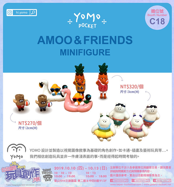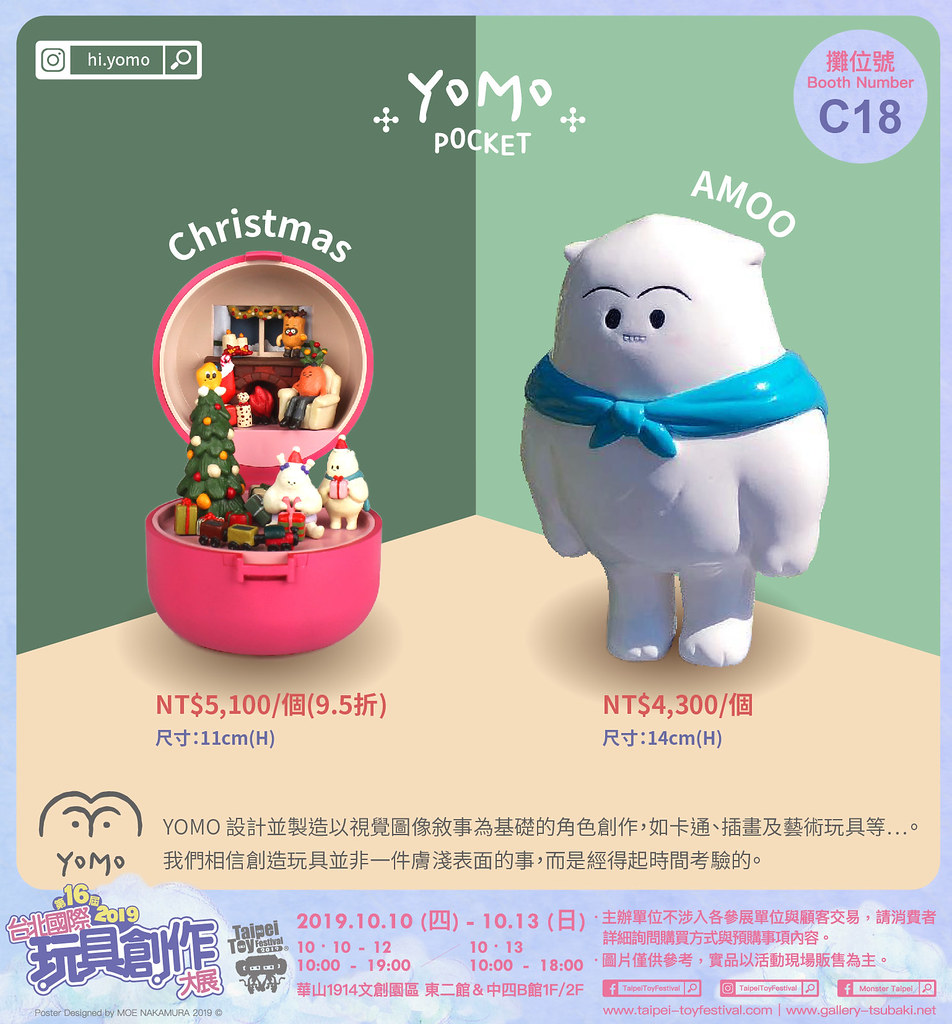 有興趣的玩具人可以參考TTF2018 第十五屆 台北國際玩具創作大展時,小編脆笛捲心酥的現場報導,現場除了可愛的口袋玩具,也有其他插畫週邊,還有設計師現場似顏繪唷!也獻上YOMO的IG讓玩具人可以追蹤按愛心,最後最重要的就是YOMO也會參加今年的TTF2019台北國際玩具創作大展,在現場C18的YOMO展位跟大家見面~玩具人不要錯過啦!