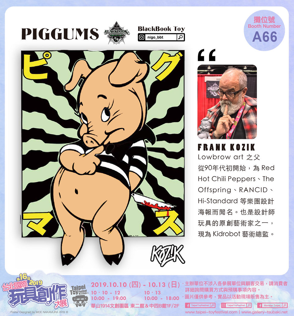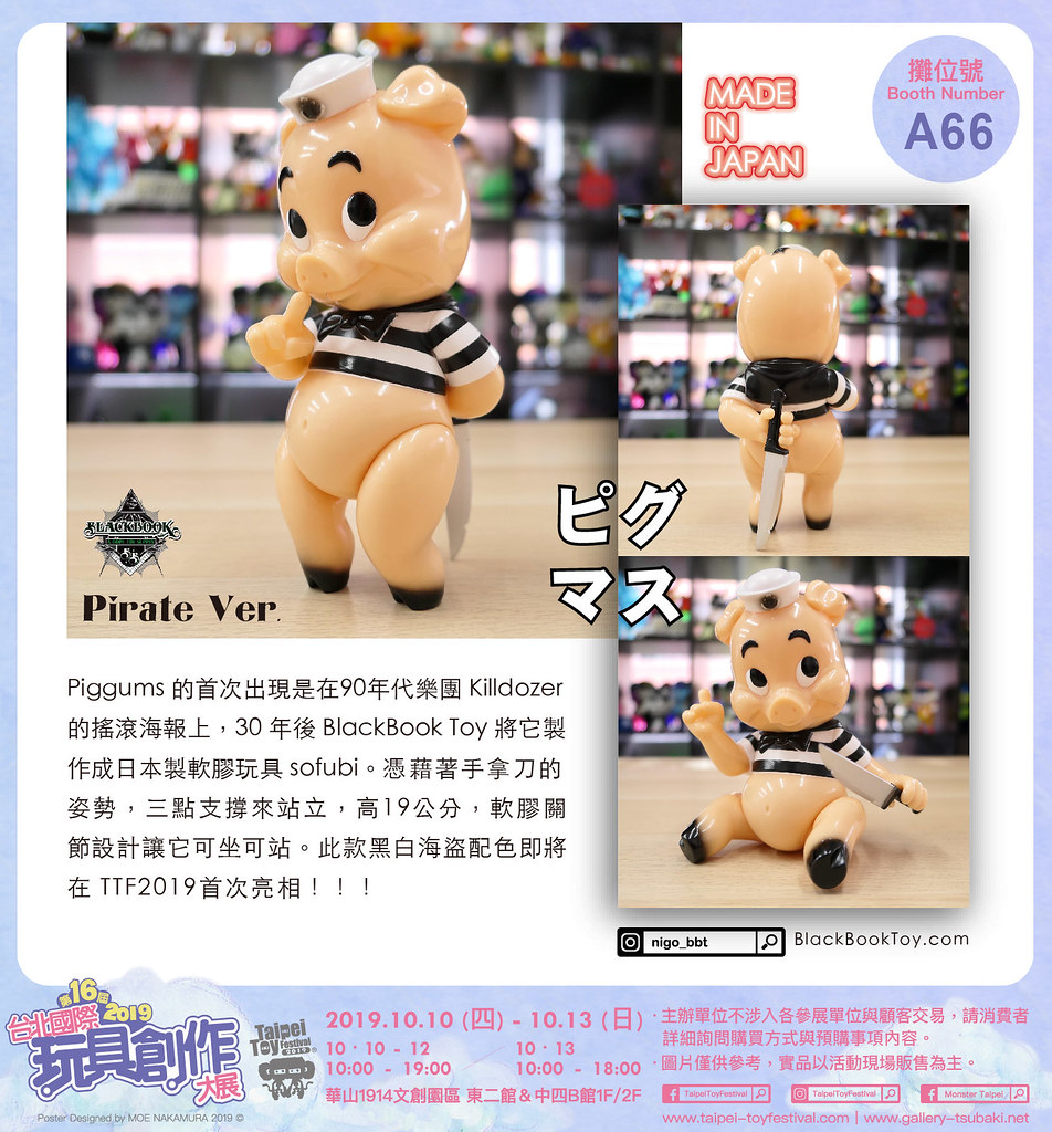 擅長與各領域藝術家合作推出日本製的精美軟膠、來自日本東京的 BlackBook Toy 旗下作品的風格相當多元,涵蓋了街頭、塗鴉、刺青、Hot Rod Culture、Lowbrow art,以及龐克搖滾......等等,每次經過他們的攤位小編總是被那擁有強烈視覺效果的作品深深吸引!這次 BlackBook Toy 主打的就是由 Lowbrow art 之父 Frank Kozik 所設計、將於 TTF 2019 首次登場的黑白海盜配色「Piggums」!