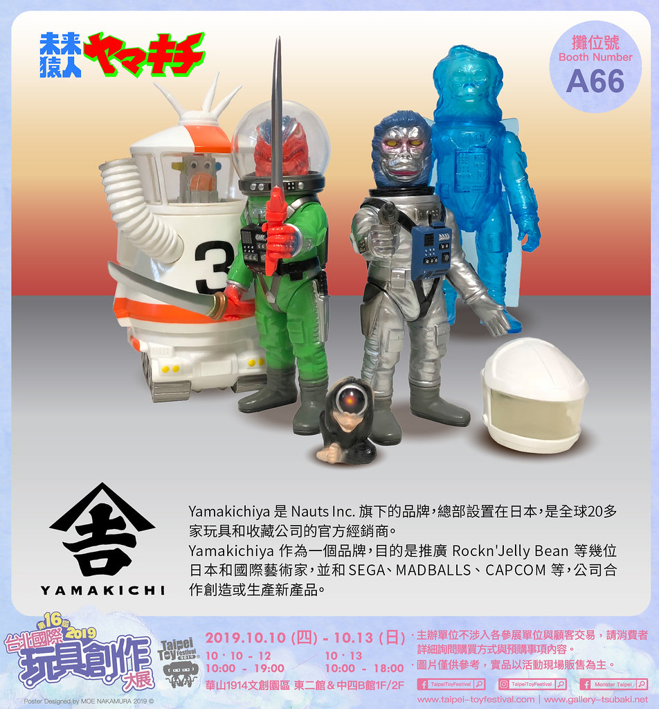 接下來是推出多款人氣軟膠玩具「未来猿人ヤマキチ」、「恐竜人ヌタ」、「ご先祖さま」的山吉屋 YAMAKICHIYA,作為全球數家玩具公司的官方經銷商,YAMAKICHIYA 有販售包含 Rockin'Jelly Bean 在內的多位日本藝術家作品,以及像是鬼娃恰吉、楳圖一雄、《忍者龜》、《鐵人28號》......主題的相關玩具、周邊,雖然還不確定這次 TTF 他們會帶來哪些驚喜,但絕對是可以期待一下的啦~!可以到他們的 instagram、官網看更多喔。