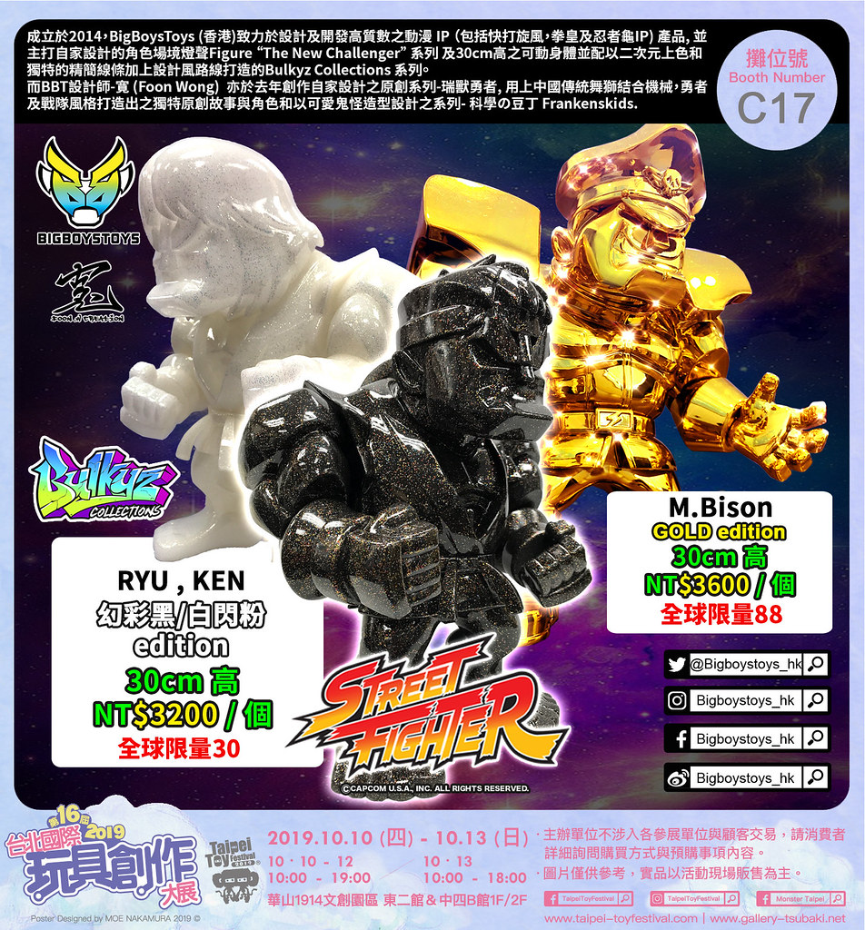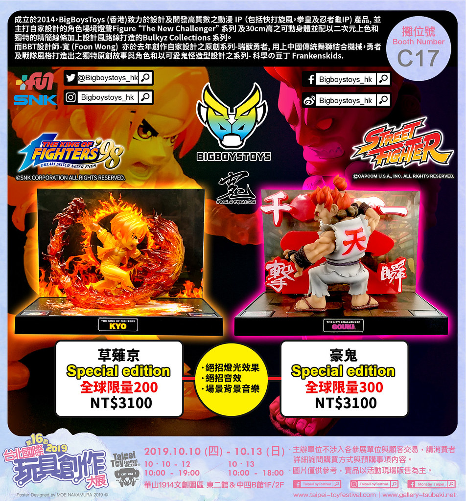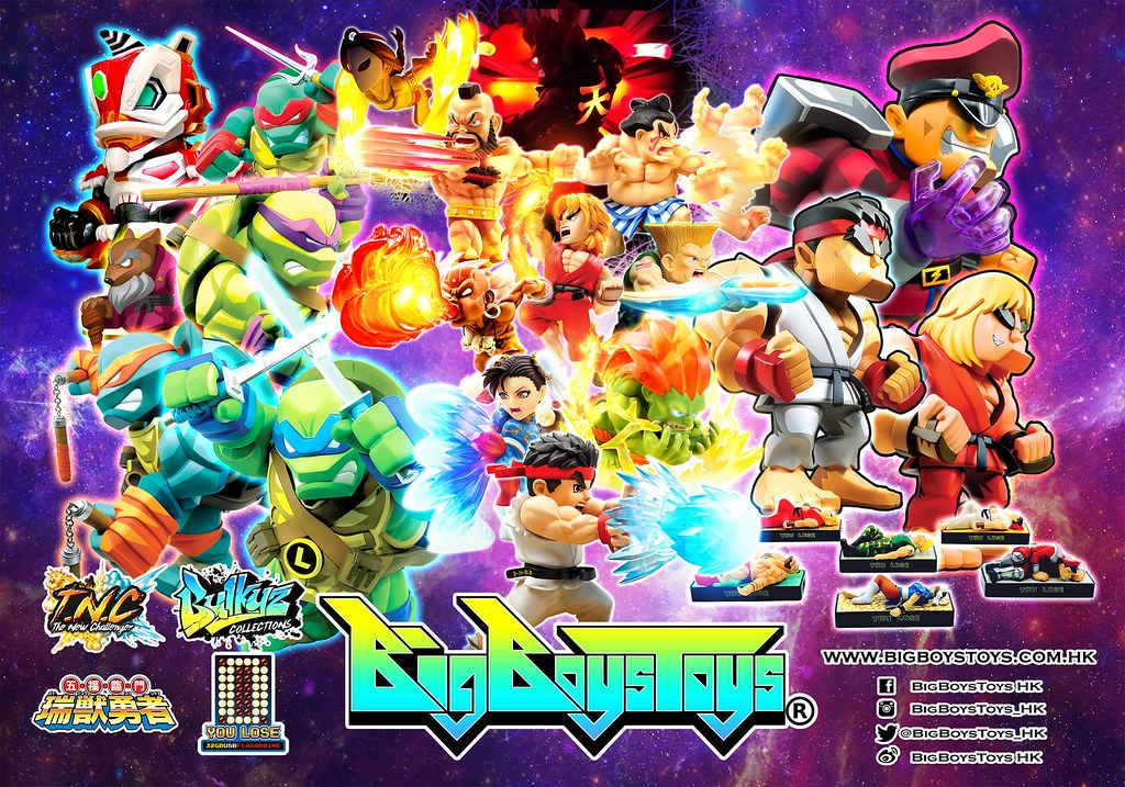 香港玩具品牌 BigBoysToys公司致力於開發高品質動漫IP產品,其中已推出快打旋風、拳皇以及忍者龜等授權商品,包含結合酷炫聲光效果與Q版人物造型的「T.N.C (The New Challenger)」、擁有粗壯身形的「Bulkyz Collection」等系列,將在本次台北國際玩具創作大展TTF2019 現場 BigBoysToys展位(C17)魄力登場!