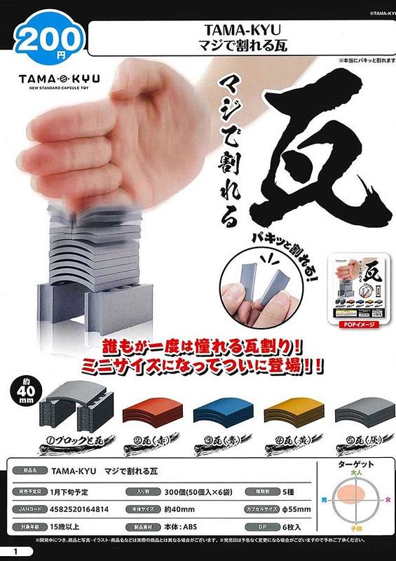 專門推出動漫相關周邊商品的Bushiroad Creative(ブシロードクリエイティブ)公司旗下新興的轉蛋品牌 TAMA-KYU(たまきゅう)帶著嶄新的元氣推出了:「顔面妄想シリーズ 隠崎さん」、「仿真泡麵調味包」和「《魔法氣泡》壽司造型鑰匙圈」等有趣又好玩的轉蛋商品後,近日又發布了新作: 「真的能劈開的瓦片(暫譯,マジで割れる瓦)」轉蛋,一轉200日幣,預計將在 2020年 01月發售。