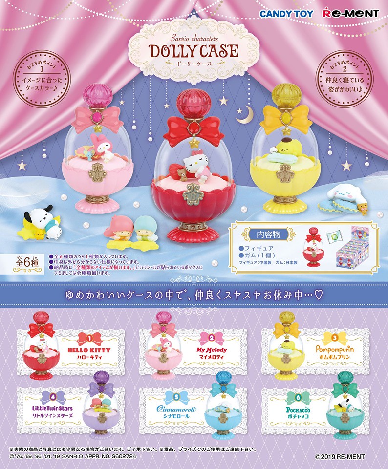 這款 DOLLY CASE 主要是將六個三麗鷗旗下最受歡迎的角色,把他們做成正在進入夢鄉睡得正香甜的模樣,然後用經過裝飾外觀,以及符合角色們的象徵色的玻璃外罩蓋起來,整體看起來就是一款相當夢幻的產品,可以看到紅色、粉色、黃色等等不同的外罩,其玻璃裡面是正在熟睡做夢的三麗鷗角色們,將它們擺在桌上觀看,會覺得療癒感 100% 啊!