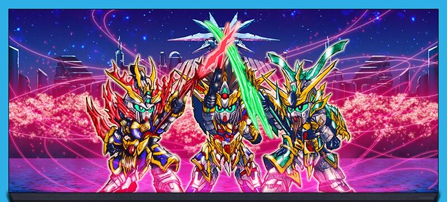 原型來自《機動武鬥傳G鋼彈》主角機「GF13-017NJII 神鋼彈」的張飛神鋼彈,雖然個性豪邁、無所畏懼,卻也常因魯莽行事導致失敗,必殺技為粉碎大地的巨拳「爆熱炎翔拳」。由於某個原因,張飛追隨關羽前往蜀區尋找天才研究家,恰巧與正義之士劉備獨角獸鋼彈結識,強力的牽絆連結三人。在經過獻上黑色三連星德姆轉蛋的「三"個"茅廬」後,他們終於見到「諸葛亮自由鋼彈」...。