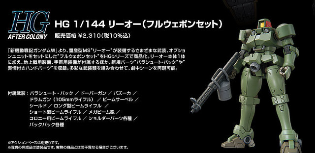 那架傳說中會因為「駕駛者的素質不同而強度也會有所變化」,在《新機動戰記鋼彈W》(新機動戦記ガンダムW)劇中相當有人氣的量產機「里歐」(リーオー),即將以新的武裝姿態回歸囉!日本萬代 BANDAI 宣布,將之前已經推出過的 HGAC 里歐以及其相關武裝配件等,一起合併為一個「里歐全武裝套組」(FULL WEAPON SET),並且將於 2020 年 1 月推出的消息。
